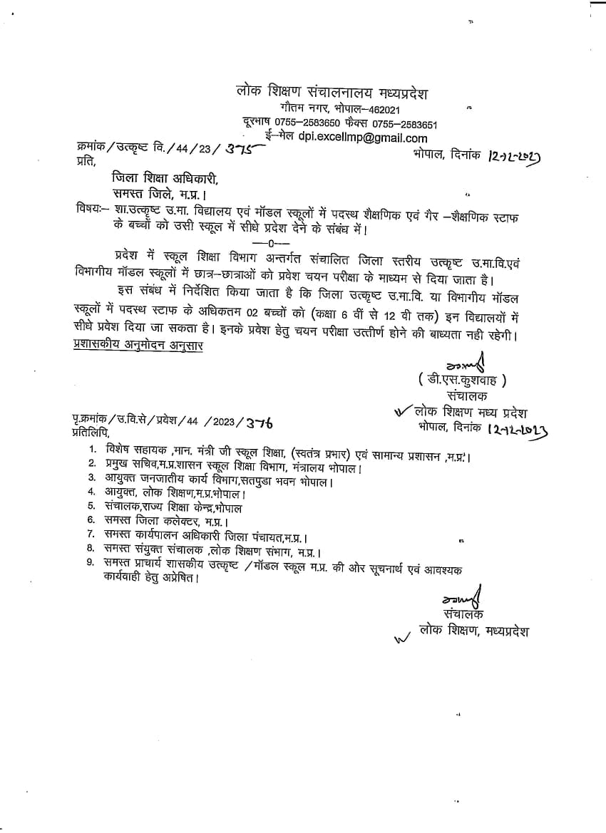 लोक शिक्षण संचालनालय ने प्रदेश के सभी जिला शिक्षा अधिकारियों (DEO) को पत्र लिखकर निर्देश दिए हैं कि मध्य प्रदेश में स्कूल शिक्षा विभाग द्वारा संचालित जिला स्तरीय उत्कृष्ट उच्चतर माध्यमिक विद्यालय एवं विभागीय मॉडल स्कूलों में पदस्थ शैक्षणिक और गैर शैक्षणिक स्टाफ के अधिकतम दो बच्चों को कक्षा 6 से कक्षा 12 तक इन विद्यालयों में सीधे प्रवेश दिया जा सकता है इसमें एडमिशन के लिए कोई चयन प्रवेश परीक्षा उत्तीर्ण होने की बाध्यता नहीं होगी।