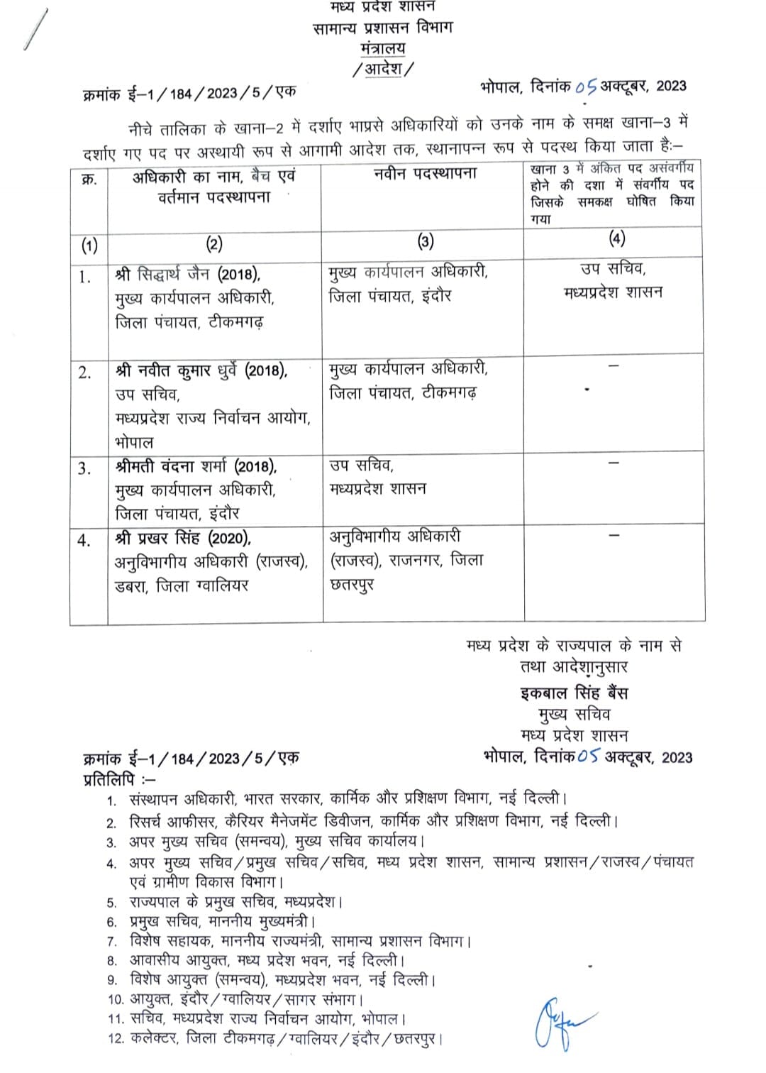 - सिद्धार्थ जैन CEO जिला पंचायत टीकमगढ़ को CEO जिला पंचायत इंदौर
