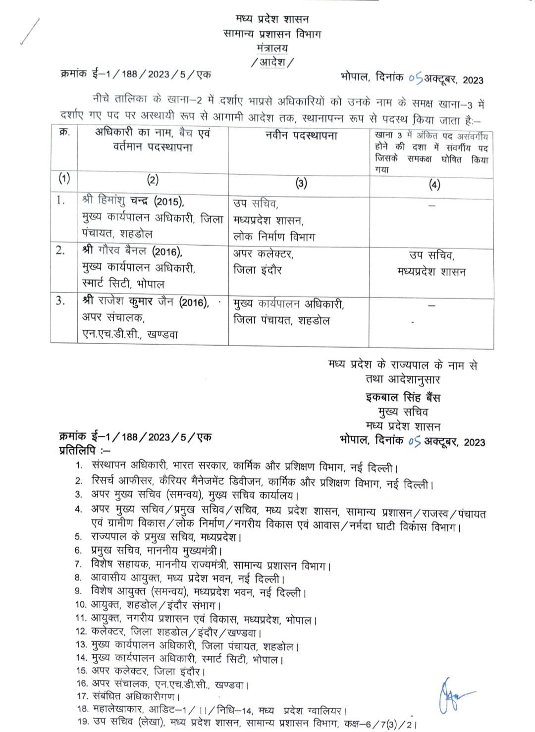 - हिमांशु चन्द्र CEO जिला पंचायत शहडोल को उप सचिव मप्र शासन