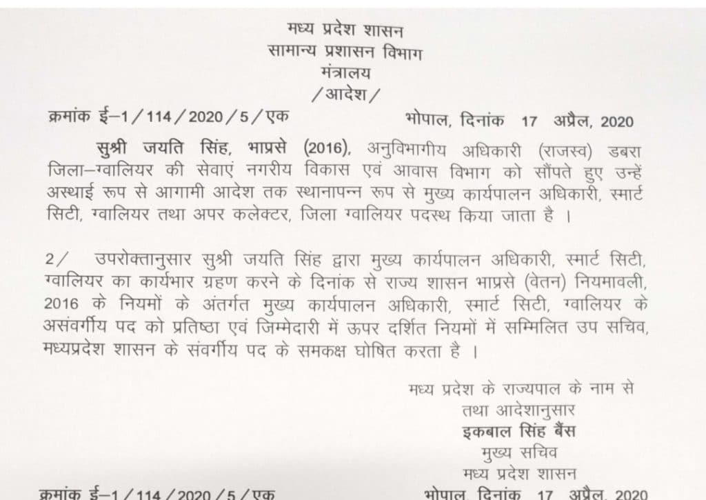 कोरोना संकटकाल और लॉकडाउन के बीच भी प्रदेश में प्रशासनिक सर्जरी जारी है। इस बार जयति सिंह अनुविभागीय अधिकारी राजस्व डबरा-ग्वालियर को अस्थाई रूप से मुख्य कार्यपालन अधिकारी स्मार्ट सिटी ग्वालियर तथा ग्वालियर का अपर कलेक्टर नियुक्त किया गया है।