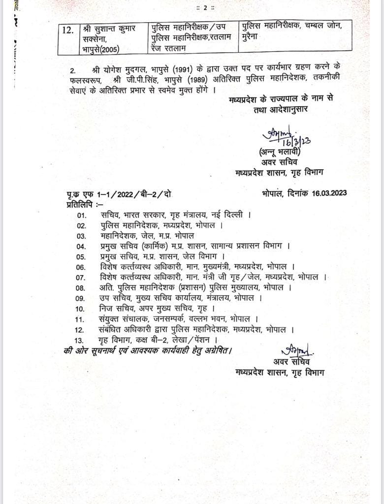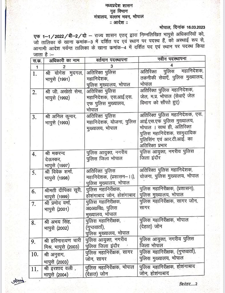 तबादला सूची में पुलिस मुख्यालय भोपाल में पदस्थ ADGP योगेश मुद्गल को ADGP तकनीकी सेवाएं पुलिस मुख्यालय भोपाल बनाया गया है, पुलिस मुख्यालय भोपाल में पदस्थ ADGP SISF जी अखेतो सेमा को ADGP जेल पदस्थ किया है, पुलिस मुख्यालय में पदस्थ ADGP योजना अनिल कुमार को ADGP SISF पुलिस मुख्यालय बनाया है साथ ही ADGP सामुदायिक पुलिसिंग की जिम्मेदारी भी सौंपी है।