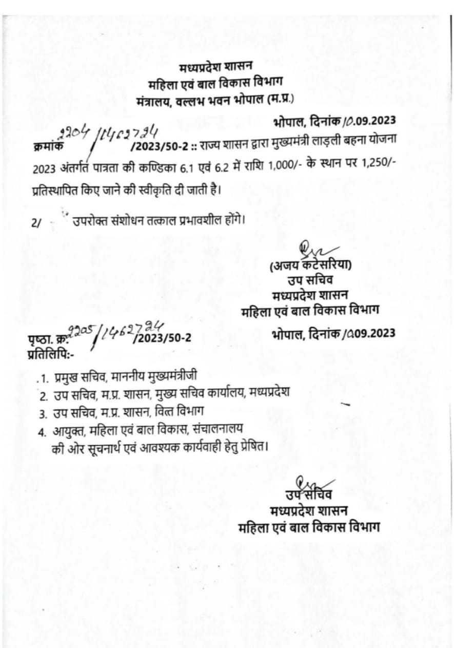 सीएम शिवराज सिंह चौहान ने मुख्यमंत्री लाड़ली बहना योजना के तहत हर महीने 1000/- रुपये देने की घोषणा की थी , जिसे बढ़ाकर उन्होंने राखी पर 1250/- कर दिया और राखी से पहले 27 अगस्त को लाड़ली बहनों के खातों में 250/- रुपये और ट्रांसफर कर दिए, मुख्यमंत्री ने कहा कि अभी पैसों का इंतजाम हो रहा है इसलिए सितंबर में 1000/- रुपये आएंगे लेकिन अक्टूबर से हर महीने 1250/- रुपये खाते में आएंगे। अब इसका आदेश सरकार ने जारी कर दिया है।