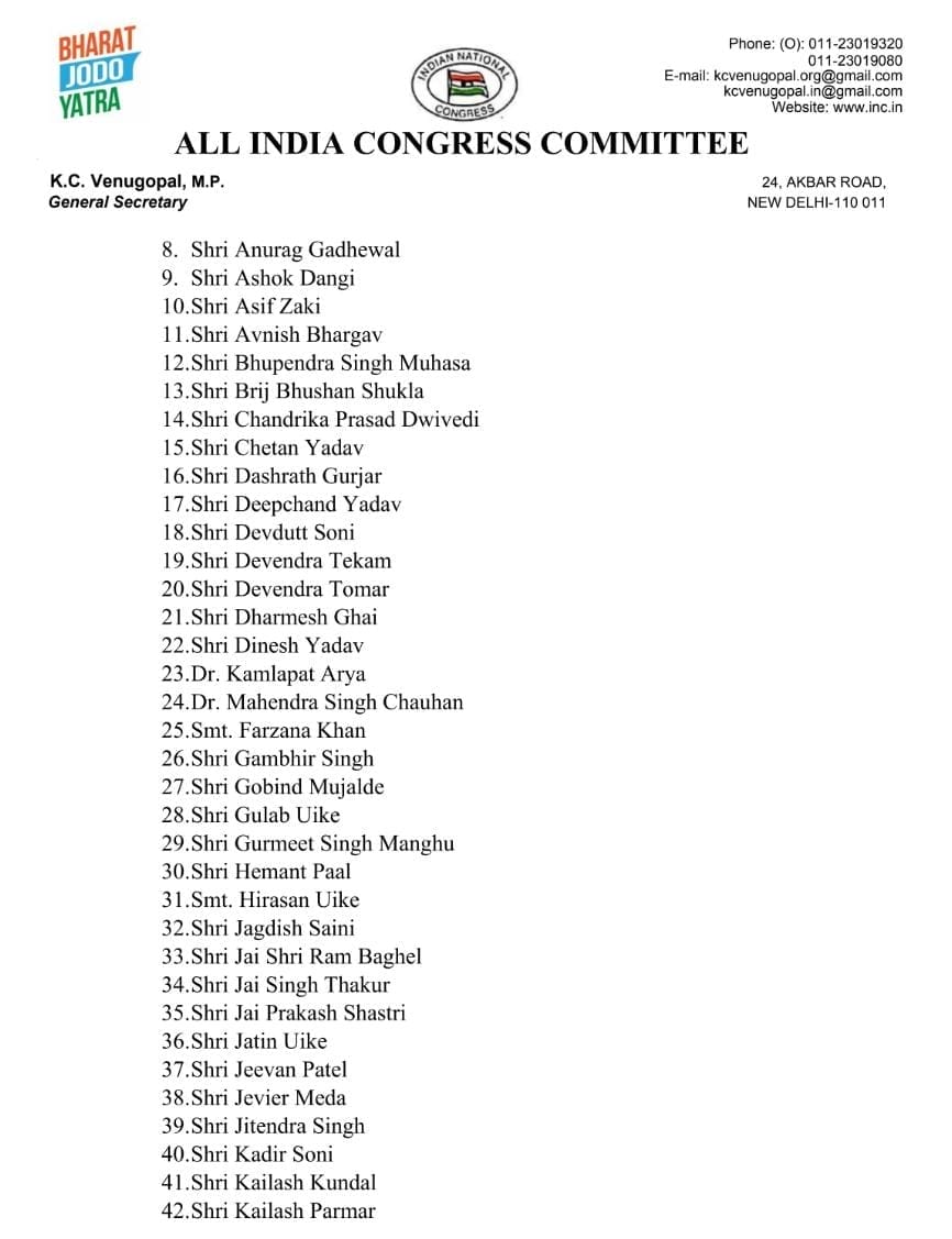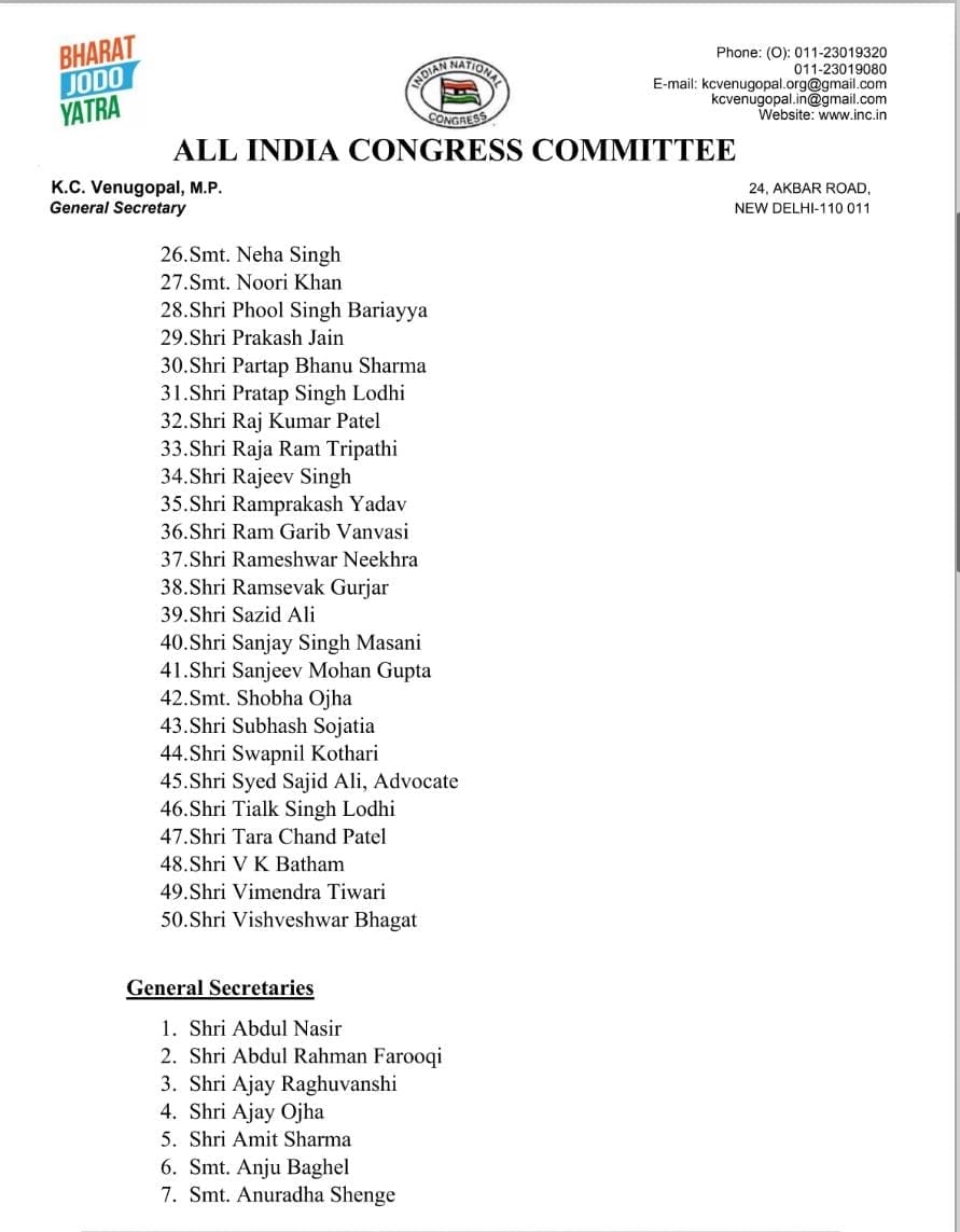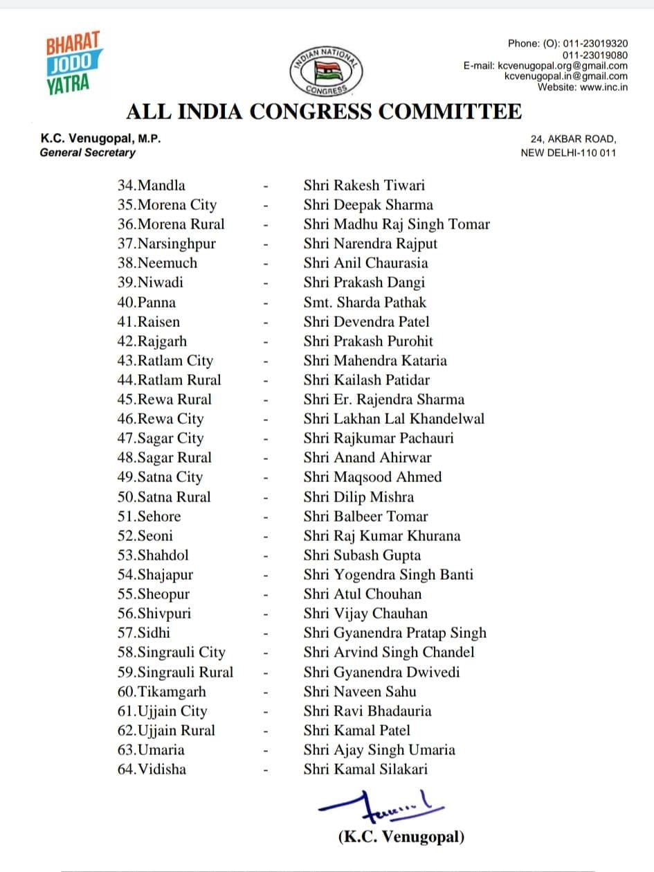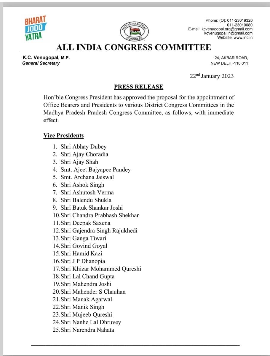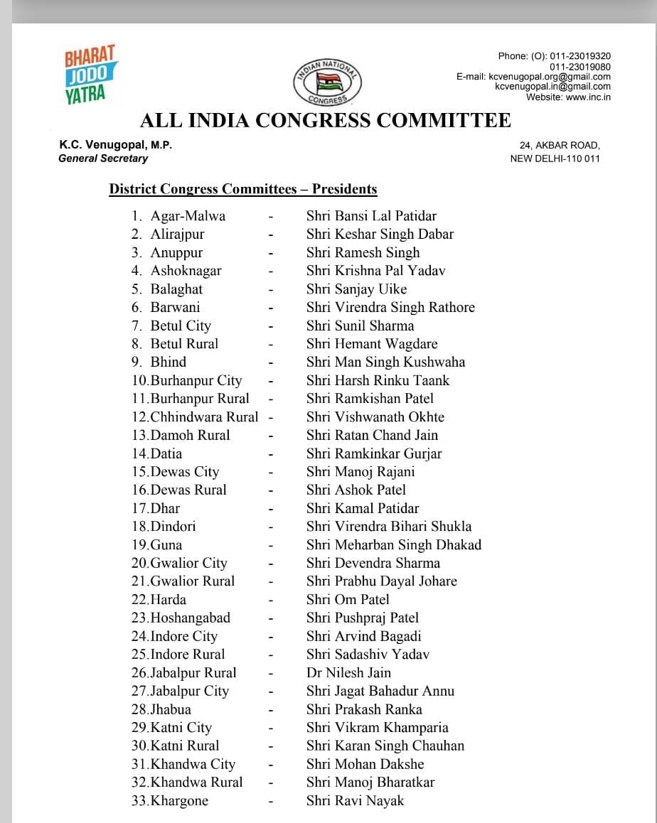 Madhya Pradesh Congress Committee : मध्यप्रदेश कांग्रेस कमेटी में विभिन्न जिला कांग्रेस कमेटी के पदाधिकारियों एवं अध्यक्षों की नियुक्ति की है, रविवार देर शाम यह लिस्ट जारी की गई है, ऑल इंडिया कांग्रेस कमेटी की तरफ़ से यह लिस्ट जारी की गई है, जिसे तत्काल प्रभावी माना गया है,जारी लिस्ट –
