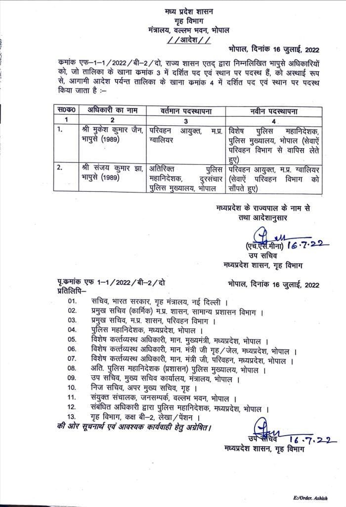 भोपाल, डेस्क रिपोर्ट। मध्यप्रदेश में एडीजी संजय कुमार झा को परिवहन आयुक्त बनाया गया है, वही आईपीएस मुकेश जैन को परिवहन आयुक्त के पद से अब विशेष पुलिस महानिदेशक बनाया गया है, मध्यप्रदेश के गृह विभाग ने आदेश जारी कर दिया है।
