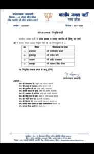 BHOPAL NEWS : बीजेपी ने चार नये जिला अध्यक्षों के नामों की घोषणा की है, मध्यप्रदेश बीजेपी अध्यक्ष वीडी शर्मा ने इन चारों नामों पर सहमति देते हुए बालाघाट, बुरहानपुर,रतलाम, छतरपुर के जिला अध्यक्षों के नाम घोषित किए है, पूर्व मंत्री रामकिशोर कावरे को बालाघाट का जिला अध्यक्ष बनाया गय है वही मनोज माने बुरहानपुर के जिला अध्यक्ष बनाए गए, वही प्रदीप उपाध्याय को रतलाम का जिला अध्यक्ष बनाया गया इसके साथ ही चंद्रभान सिंह गौतम छतरपुर के जिला अध्यक्ष बनाए गए है।