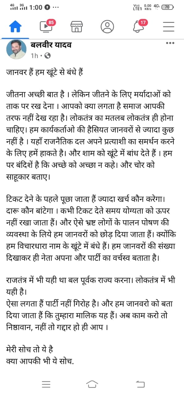 वही बीजेपी के पूर्व पार्षद बलवीर यादव का भी इस बार टिकट न मिलने पर दर्द झलका है, भोपाल में वार्ड 6 से दावेदारी कर रहे बलवीर यादव ने सोशल मीडिया पर लिखा ‘हम जानवर है खूंटे से बंधे है’ उन्होंने बीजेपी पार्टी पर उठाए सवाल –