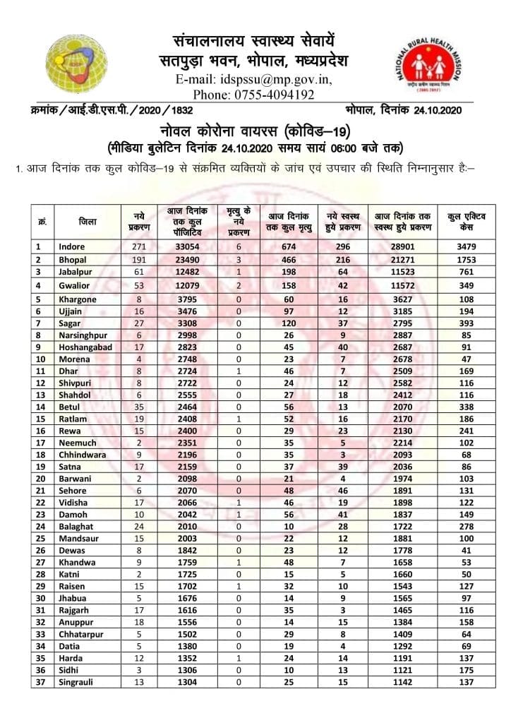 प्रदेश में अब सक्रिय मरीजों की संख्या 11 हजार 477 हो गई। इंदौर में 271 भोपाल में 191 ग्वालियर में 53 और जबलपुर में 61 नए केस मिले हैं|