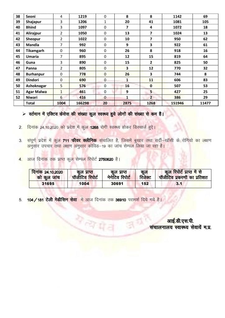 आज प्रदेशभर में 1268 कोरोना मरीज स्वस्थ हुए हैं। वहीं दूसरी ओर आज 20 कोरोना मरीजों की उपचार के दौरान मौत हो गई। प्रदेश में अब तक 2875 मरीजों की कोरोना से मौत हो चुकी है। वहीं प्रदेश में अब तक 1 लाख 51 हजार 946 मरीज स्वस्थ हुए हैं।