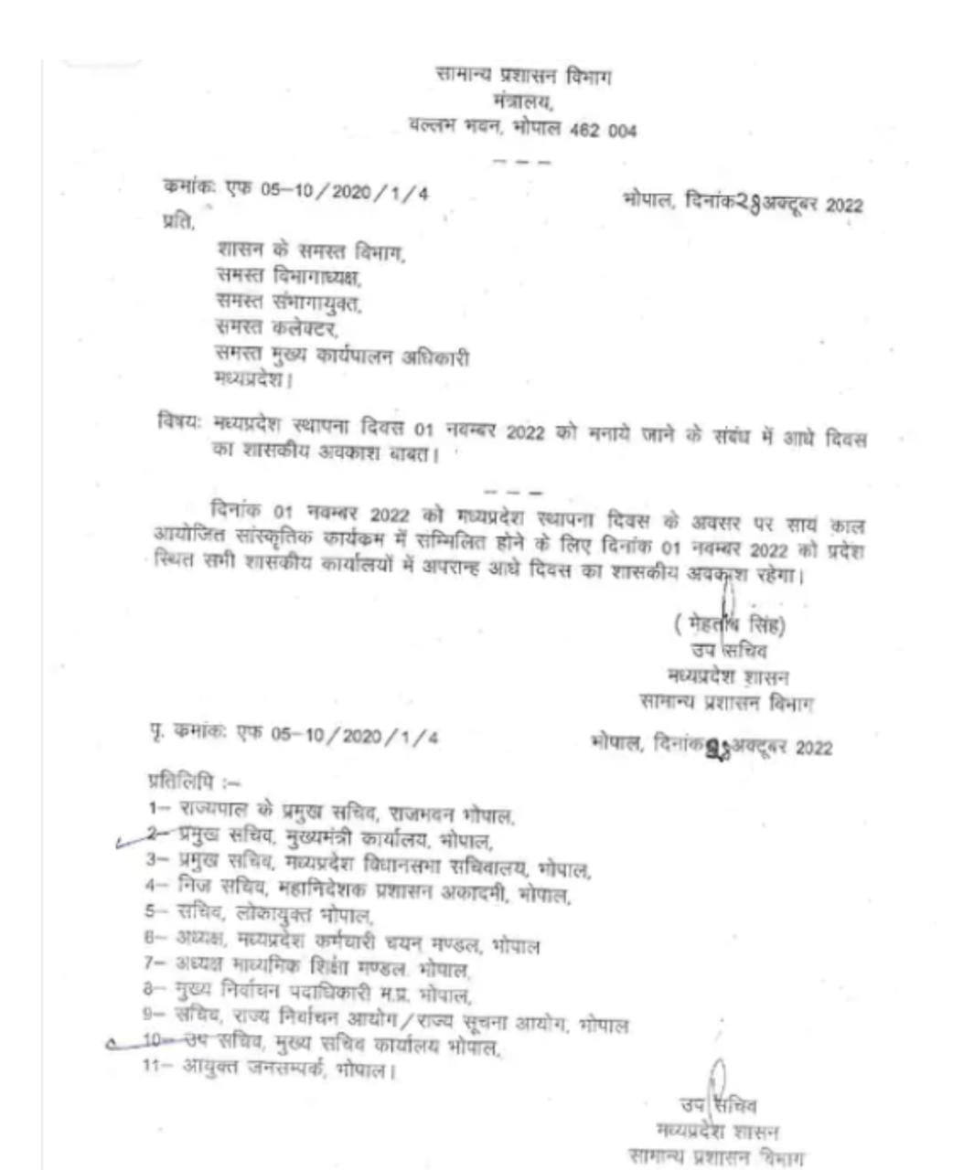 भोपाल, डेस्क रिपोर्ट। मध्यप्रदेश के स्थापना दिवस 1 नवंबर को राज्य के सरकारी दफ्तरों में आधे दिन ही काम होगा। 1 नवंबर को सरकारी दफ्तरों में आधे दिन की छुट्टी का आदेश जारी कर दिया गया है। सरकारी ऑफिसों में आधे दिन की छुट्टी घोषित किए जाने का आदेश सामान्य प्रशासन विभाग ने जारी किया हैं।