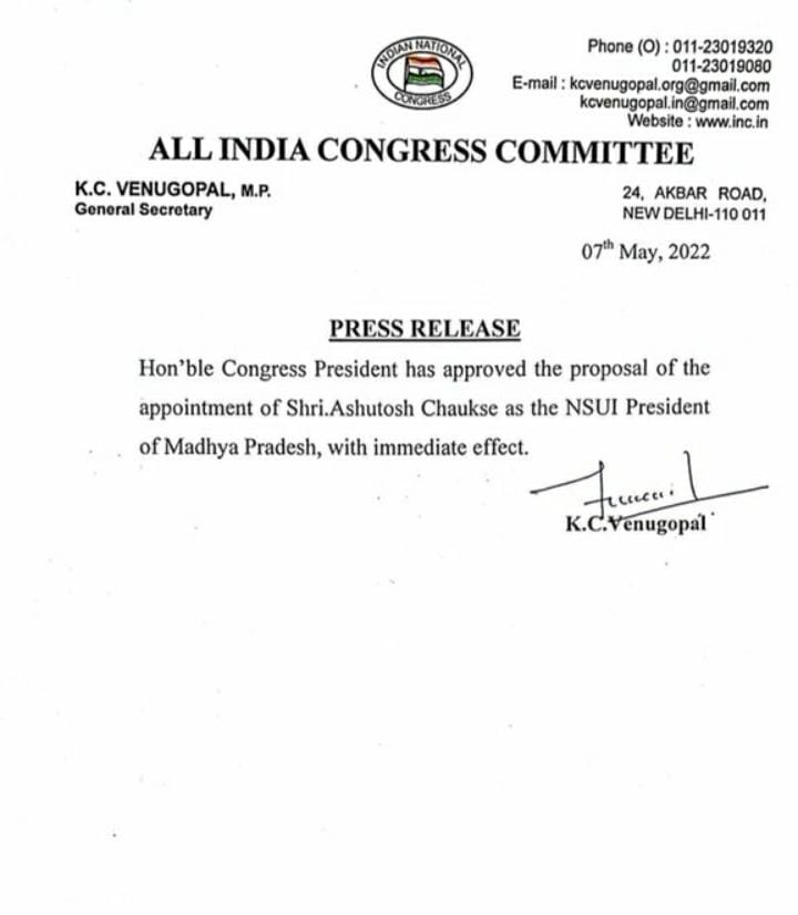 भोपाल, डेस्क रिपोर्ट। आशुतोष चौकसे को मध्यप्रदेश एनएसयूआई का नया प्रदेश अध्यक्ष बनाया गया है, वही पार्टी ने तीन महीने पहले ही बनाए गए अध्यक्ष पद से मंजू त्रिपाठी को हटा दिया है, उनकी जगह पर आशुतोष चौकसे को एमपी एनएसयूआई का नया अध्यक्ष बनाया गया है, केसी वेणुगोपाल ने आदेश जारी किया है। आशुतोष एनएसयूआइ के प्रदेश उपाध्यक्ष एवं भोपाल जिला अध्यक्ष भी है, हालांकि इतनी जल्दी एनएसयूआई प्रदेश अध्यक्ष को बदले जाने के पीछे की वजह पार्टी के नेताओं की नाराजगी बताई जा रही है।
