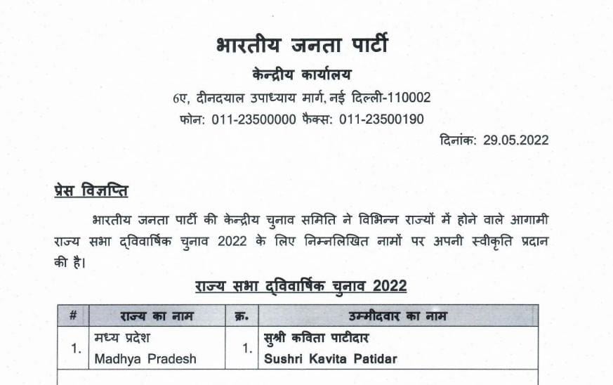 भोपाल, डेस्क रिपोर्ट। मध्य प्रदेश में राज्यसभा चुनाव के लिए बीजेपी ने भी अपने एक उम्मीदवार के नाम की घोषणा कर दी है, बीजेपी ने प्रदेश महामंत्री कविता पाटीदार के नाम की मध्यप्रदेश से राज्यसभा उम्मीदवार के तौर पर घोषणा की है। गौरतलब है कि प्रदेश की 3 राज्यसभा सीटें अगले महीने खाली हो रही हैं, इन्हीं सीटों को लेकर कांग्रेस ने विवेक तंखा के नाम की घोषणा की है वही बीजेपी ने रविवार शाम कविता पाटीदार के नाम की सूची जारी की, विधायकों के मौजूदा संख्याबल के हिसाब से 2 सीटें बीजेपी और 1 सीट कांग्रेस को मिलने की संभावना है।