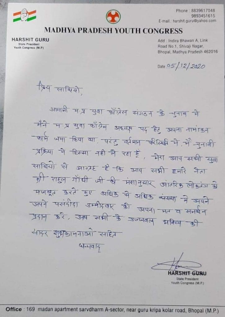 हर्षित गुरु ने पत्र जारी कर नमानांकन वापस लेने की जानकारी दी है| जिसमे उन्होंने कहा है कि मैंने मप्र युवा कांग्रेस अध्यक्ष पद के लिए अपना नामांकन फ़ार्म जमा किया था| लेकिन वर्तमान परिस्थिति में मैं चुनावी प्रक्रिया में हिस्सा नहीं ले पा रहा हु| उन्होंने सभी साथियों से आग्रह किया है कि आंतरिक लोकतंत्र को मजबूत करते हुए अधिक से अधिक संख्या में अपने पसंदीदा उम्मीदवार को अपना मत व समर्थन प्रदान करें|
