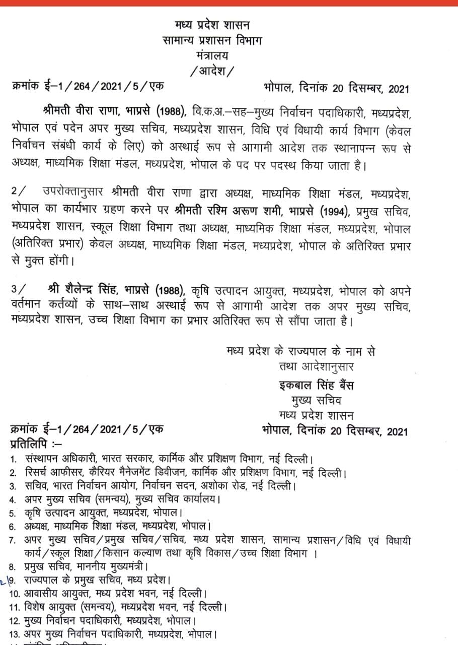 भोपाल, डेस्क रिपोर्ट। राज्य शासन ने आईएएस अफसरों को अतिरिक्त प्रभार सौंपे हैं। सोमवार को जारी आदेश में मुख्य निर्वाचन पदाधिकारी एवं पदेन अपर मुख्य सचिव विधि और विधायी कार्य विभाग (केवल निर्वाचन संबंधी कार्य के लिए) वीरा राणा को माध्यमिक शिक्षा मंडल के अध्यक्ष पद का प्रभार सौंपा गया है। राणा के प्रभार संभालने के बाद प्रमुख सचिव स्कूल शिक्षा विभाग माशिमं अध्यक्ष के अतिरिक्त प्रभार से मुक्त होंगी। इसी आदेश में कृषि उत्पादन आयुक्त शैलेंद्र सिंह को एसीएस उच्च शिक्षा विभाग का अतिरिक्त प्रभार सौंपा गया है। एक अन्य आदेश में अनुपम राजन उच्च शिक्षा विभाग के प्रमुख सचिव को मुख्य निर्वाचन पदाधिकारी और पदेन प्रमुख सचिव विधि और विधायी कार्य विभाग (केवल निर्वाचन संबंधी कार्य के लिए) के पद पर पदस्थ किया गया है।