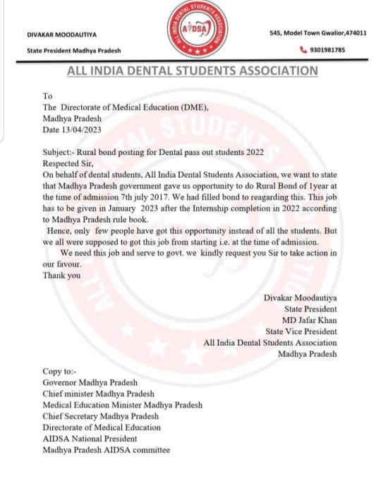 बहरहाल डेंटल स्टूडेट्स के साथ जो हुआ उसे धोखा कहा जाये, भावनात्मक छलावा कहा जाये या कुछ और, आखिर उनका एक साल बर्बाद होने का जिम्मेदार कौन हैं ? क्या डीएमई हैं या चिकित्सा शिक्षा विभाग के वो अधिकारी जिन्होंने राजपत्र में बीडीएस के लिए भी ग्रामीण बॉन्ड छपने दे दिया या वो अधिकारी जिन्होंने आंख बंद कर बस अधिकारियों के निर्देशों का पालन करते हुए बॉन्ड भरवा लिया और फिर नोटिस भेजते रहे बाद में नियम बताकर नौकरी देने से इंकार कर दिया। उम्मीद की जाना चाहिए कि प्रदेश के संजीदा मुख्यमंत्री शिवराज सिंह चौहान इस पर कोई ठोस निर्णय जरूर लेंगे, जिससे डेंटल स्टूडेंट्स के बर्बाद हुए साल की भरपाई हो पाए।