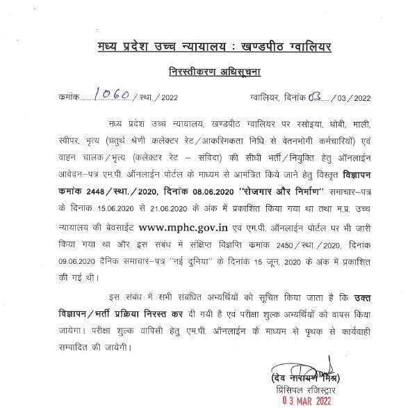 मध्यप्रदेश हाईकोर्ट की ग्वालियर बेंच द्वारा निरस्तीकरण अधिसूचना क्रमांक 1060 दिनांक 3 मार्च 2022 जारी की गई।मध्य प्रदेश उच्च न्यायालय की ग्वालियर खंडपीठ से जारी अधिसूचना के अनुसार रसोईया, धोबी, माली, स्वीपर, भृत्य, सभी चतुर्थ श्रेणी कलेक्ट्रेट आकस्मिकता निधि से वेतन भोगी कर्मचारियों एवं वाहन चालक भृत्य कलेक्ट्रेट संविदा कर्मचारी की सीधी भर्ती के लिए ऑनलाइन आवेदन एमपी ऑनलाइन पोर्टल के माध्यम से आमंत्रित किए गए थे।