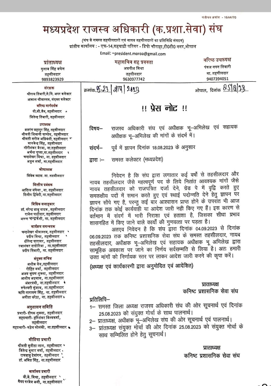 इस पत्र में लिखा गया है कि ‘संघ द्वारा पिछले कई सालों से तहसीलदार और नायब तहसीलदार जैसे महत्वपूर्ण पद के लिये आवश्यक मांगों जैसे नायब तहसीलदार को राजपत्रित दर्जा देने, ग्रेड पे में वृद्धि करते हुए समकक्षीय पदों में समान करते हुए एवं स्थाई पदोन्नति देने हेतु ज्ञापन पर ज्ञापन सौपे गए हैं। परन्तु कई बार आश्वासन प्राप्त होने के उपरांत भी आज दिनांक तक कोई कार्यवाही या आदेश जारी नहीं किए गए हैं। इस कारण से वर्तमान में संवर्ग में भारी निराशा एवं हताशा है, जिसका सीधा प्रभाव शासनहित में किए जाने वाले कार्यों की गुणवत्ता पर पड़ता है। अतएव निवेदन है कि संघ द्वारा दिनांक 04.09.2023 से दिनांक 06.09.2023 तक कनिष्ट प्रशासनिक सेवा संघ के समस्त तहसीलदार, नायब तहसीलदार, अधीक्षक भू-अभिलेख एवं सहायक अधीक्षक भू अभिलेख द्वारा सामूहिक अवकाश पर जाने का निर्णय सर्वसम्मति से लिया है अतः हमारी उक्त मांगों को निर्णायक स्तर पर लाकर आदेश जारी करने की कृपा करें।’ प्रदेश भर के तहसीलदार और नायब तहसीलदारों के सामूहिक अवकाश पर जाने से कई कामों असर पड़ेगा। सीमांकन, नामांतरण, बंटाकन सहित रेवेन्यू से जुड़े कार्य प्रभावित होने की आशंका है।