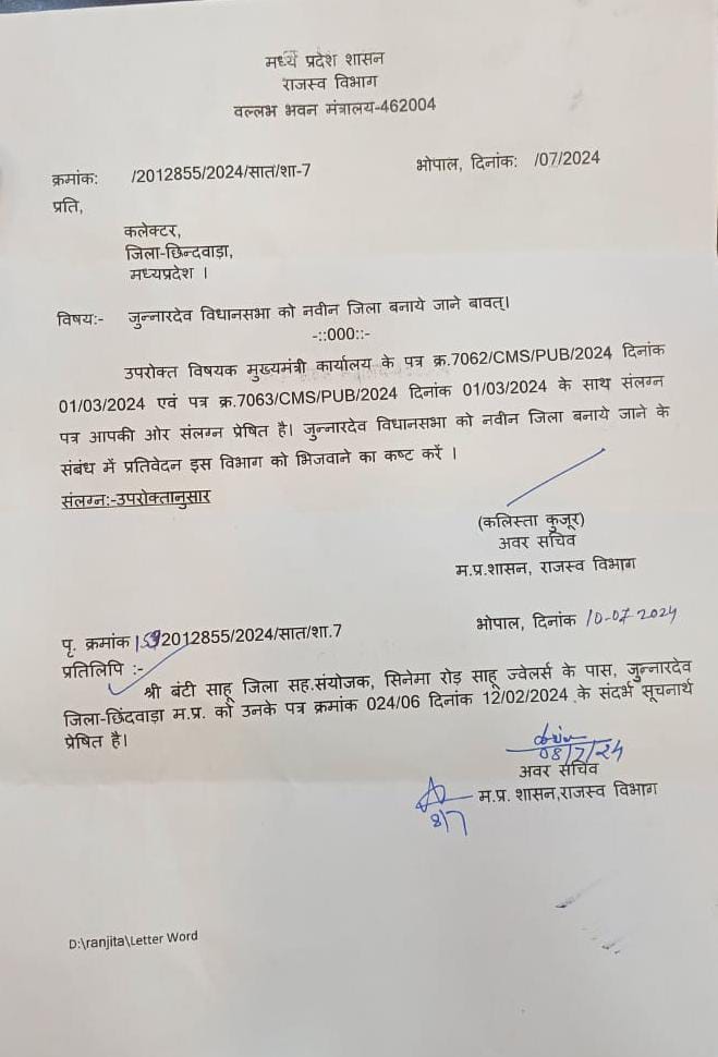 MP News : मध्य प्रदेश में जल्दी ही जिलों की संख्या बढ़ सकती है, सरकार जल्दी ही छिंदवाड़ा जिले की विधानसभा जुन्नारदेव को अलग जिला बना सकती है, गौरतलब है कि यदि ऐसा होता है तो छिंदवाड़ा जिला बहुत जल्दी दूसरी बार टूटेगा, पिछले साल 2023 में छिंदवाड़ा से पांढुर्ना को अलग कर नया जिला बनाया गया था। राजस्व विभाग ने छिंदवाड़ा कलेक्टर को इस आशय का पत्र भेजा है और उनसे छिंदवाड़ा की जुन्नारदेव विधानसभा को अलग जिला बनाये जाने को लेकर प्रतिवेदन मांगा है।