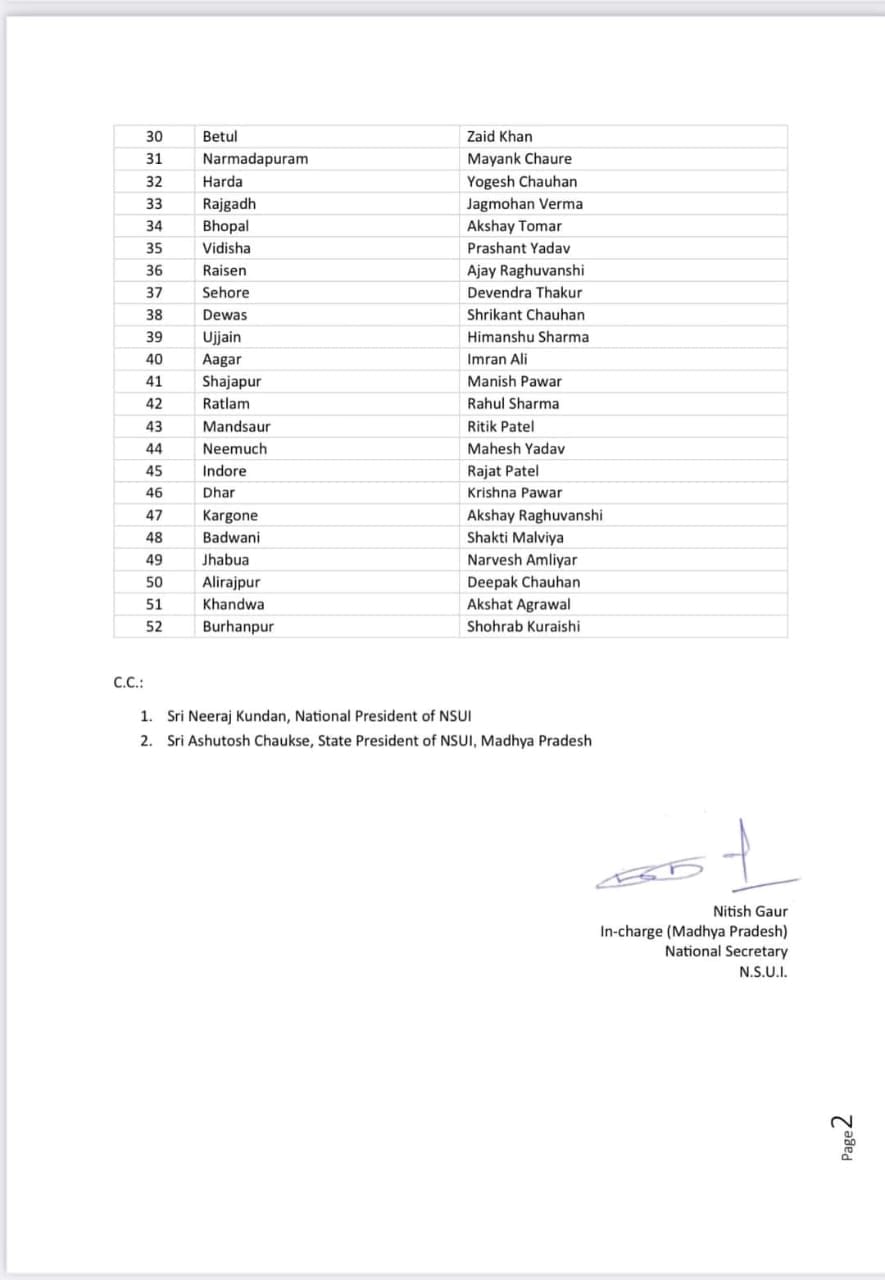 एनएसयूआई के महासचिव एवं मप्र के प्रभारी नितीश गौर ने प्रदेश के 52 जिलों के जिला अध्यक्षों की सूची जारी कर दी है, गौरतलब है कि पिछले दिनों मुख्यमंत्री शिवराज सिंह चौहान के खिलाफ पोस्टर अभियान में NSUI ने बढ़ चढ़कर हिस्सा लिया था और 50 प्रतिशत कमीशन वाले पोस्टर छिपाने में अहम् भूमिका निभाई थी, पार्टी अब इनकी सक्रियता को चुनावों में यूज करना चाहती है।