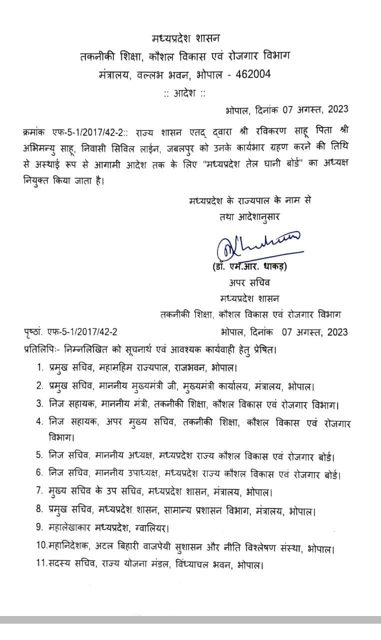 मध्य प्रदेश शासन के तकनीकी शिक्षा, कौशल विकास एवं रोजगार विभाग के अपर सचिव डॉ एम आर धाकड़ ने रविकरण साहू की नियुक्ति का आदेश जारी किया है, रविकरण साहू जबलपुर से आते हैं, वे राष्ट्रीय तैलिक सभा के प्रदेश अध्यक्ष हैं, रविकरण साहू 2013 से भारतीय जनता पार्टी के सक्रिय कार्यकर्ता हैं। भाजपा प्रदेश आईटी सेल के प्रभारी रह चुके हैं।