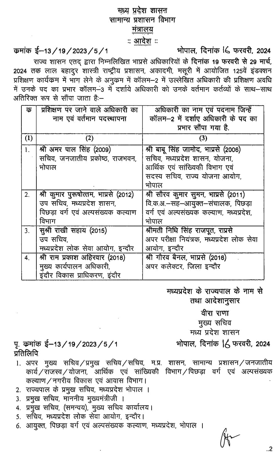 सामान्य प्रशासन विभाग द्वारा जारी आदेश में बताया गया है कि 19 फरवरी से 29 मार्च तक लाल बहादुर शास्त्री राष्ट्रीय प्रशासन अकादमी मसूरी में 125 वां इन्डक्शन प्रशिक्षण कार्यक्रम चलेगा जिसमें मध्य प्रदेश में पदस्थ भारतीय प्रशासनिक सेवा के चार अधिकारी भी शामिल होने जा रहे है, इसलिए उनका प्रभार दूसरे अधिकारियों को सौंपा जा रहा है।