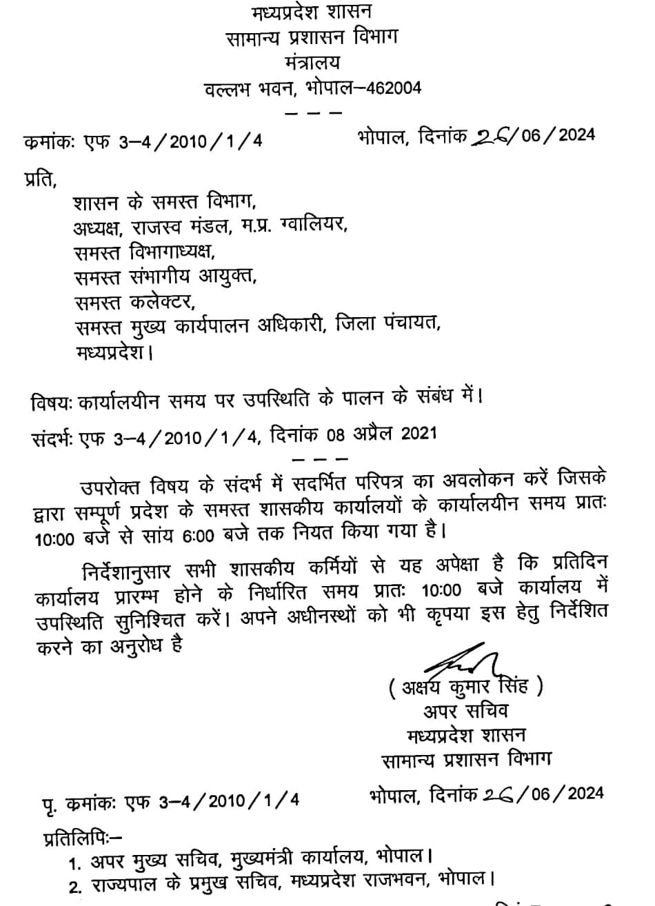 लेकिन पिछले कुछ समय से देखने में आ रहा है कि सरकारी दफ्तरों में कर्मचारी अधिकारी 10:30, 11 बजे तक पहुंच रहे हैं। लेटलतीफी की शिकायत सीएम डॉ मोहन यादव के संज्ञान में भी आई उसके बाद उन्होंने सख्ती के निर्देश दिए, सामान्य प्रशासन विभाग ने आज 26 जून को एक आदेश जारी कर सभी विभागों, संभाग आयुक्तों, कलेक्टर्स को याद दिलाया है कि शासकीय सेवकों का सुबह 10 बजे तक ऑफिस पहुंचना सुनिश्चित करें। यानि अब तय है कि जो देरी से दफ्तर पहुंचेगा उसकी खैर नहीं है।