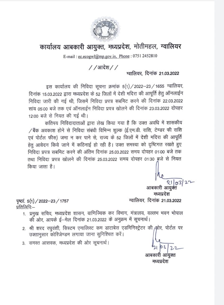 कार्यालय आबकारी आयुक्त मध्य प्रदेश ग्वालियर द्वारा 15 मार्च 2022 को जारी आदेश के मुताबिक 01 अप्रैल 2022 से 31 मार्च 2023 तक मध्य प्रदेश के 52 जिलों के लिए ऑनलाइन निविदाएं ई टेंडर के माध्यम से आमंत्रित की गई थी। अभी तक निविदा जमा करने के लिए 22 मार्च 2022 शाम 5 बजे तक का समय निश्चित किया गया था जबकि निविदाएं अगले दिन 23 मार्च को दोपहर 12 बजे खोली जानी तय किया गया था।