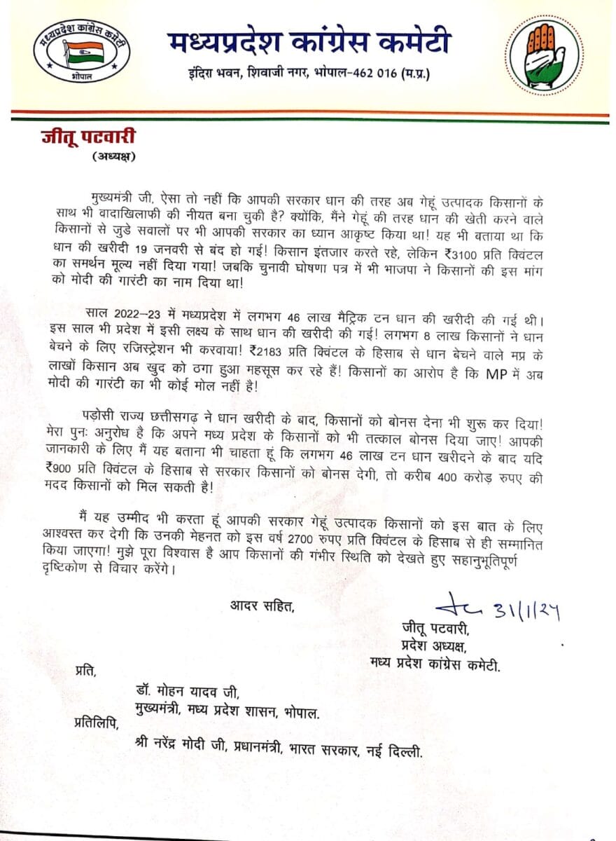 Jitu Patwari letter to CM Dr. Mohan Yadav : मध्य प्रदेश सरकार ने गेहूं की खरीदी के लिए पंजीयन शुरू किये जाने की सूचना जारी की है , पंजीयन 5 फरवरी से शुरू होकर 1 मार्च तक होंगे। उम्मीद है कि सरकार 15 मार्च से गेहूं की खरीद शुरू कर देगी, लेकिन उससे पहले ही सरकार द्वारा घोषित गेहूं के समर्थन मूल्य (MSP) को लेकर कांग्रेस ने आपत्ति उठाई है और इसे किसानों के साथ धोखा बताया है। प्रदेश कांग्रेस अध्यक्ष जीतू पटवारी ने मुख्यमंत्री को उनकी पार्टी का वचन पत्र और मोदी की गारंटी याद दिलाते हुए पत्र लिखा है और वादे के मुताबिक समर्थन मूल्य 2700/- रुपये रुपये प्रति क्विंटल किये जाने की मांग की है, आपको बता दें कि सरकार ने अभी 2250/-रुपये प्रति क्विंटल पर समर्थन मूल्य की घोषणा की है ।