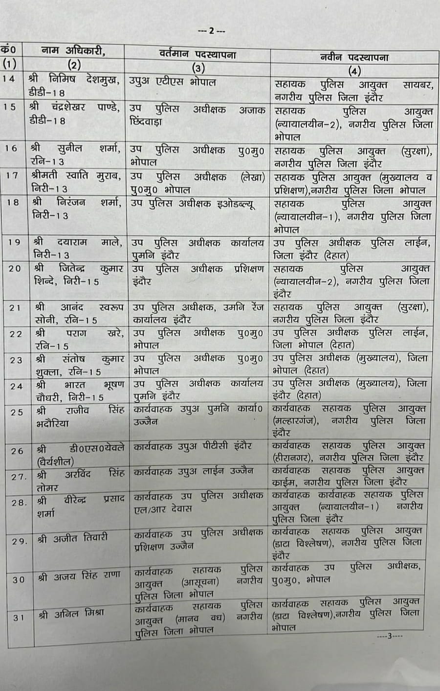 भोपाल, डेस्क रिपोर्ट। मध्य प्रदेश में इस समय तबादलों (MP Transfer) का दौर जारी है। सरकार किसी न किसी विभाग की तबादला सूची रोज जारी कर रही है। आज गुरुवार को गृह विभाग ने पुलिस के वरिष्ठ अधिकारियों की तबादला (MP Police Transfer) सूची जारी की है। इस सूची में अतिरिक्त पुलिस अधीक्षक/अतिरिक्त पुलिस आयुक्त, उप पुलिस अधीक्षक/सहायक पुलिस आयुक्त स्तर के अधिकारी प्रभावित हुए हैं।