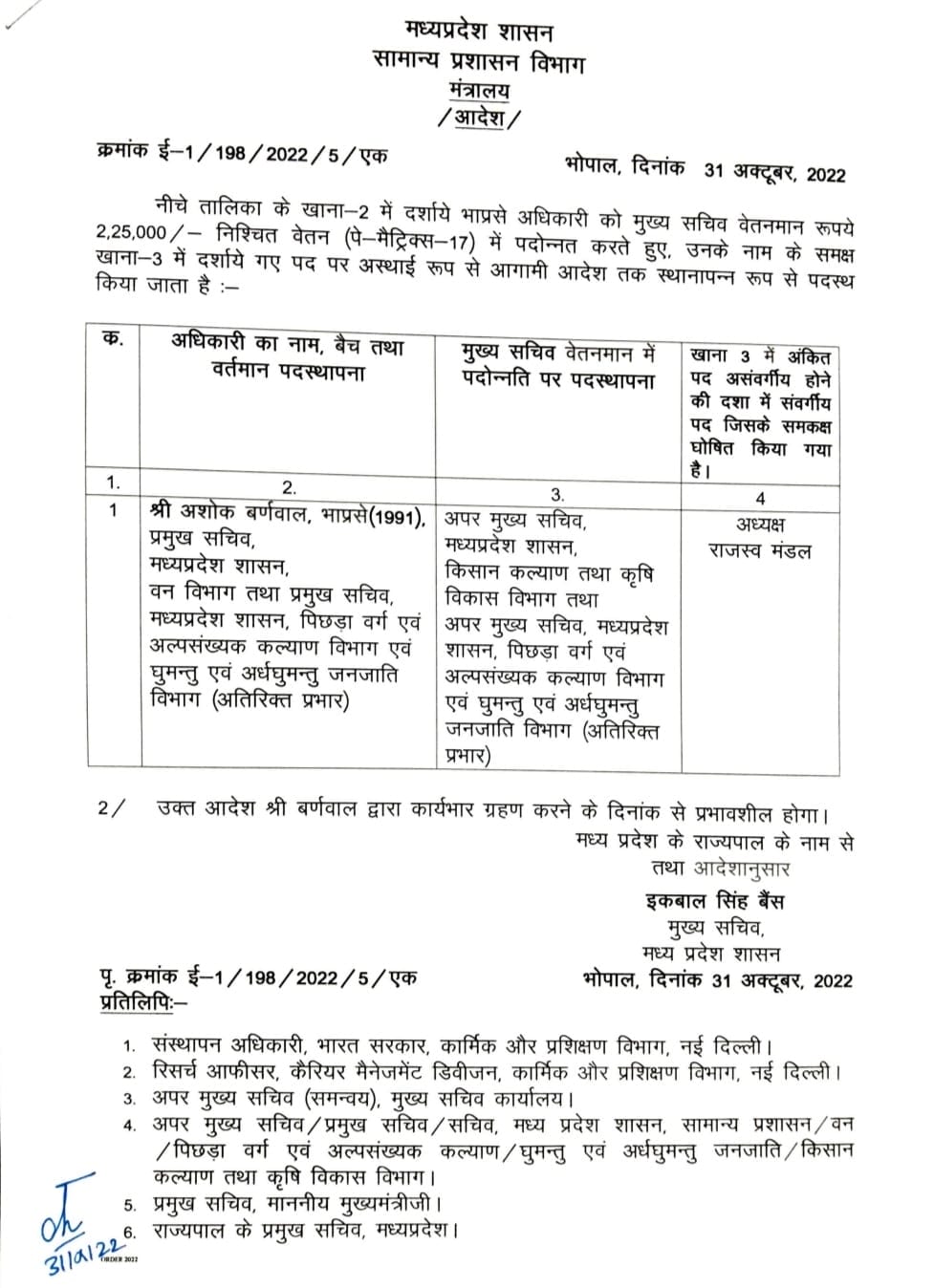 भोपाल, डेस्क रिपोर्ट। मप्र सरकार में आज एक IAS अधिकारी का प्रमोशन (MP Promotion) कर आदेश जारी किया है। मप्र सामान्य प्रशासन विभाग (MP General Administration Department ) ने आज जारी एक आदेश में भारतीय प्रशासनिक सेवा के वरिष्ठ अधिकारी अशोक वर्णवाल की मुख्यसचिव वेतनमान में पदोन्नति कर उन्हें अपर मुख्य सचिव (MP IAS Promotion) बनाया है और कई विभागों की जिम्मेदारी (MP Transfer) दी है।