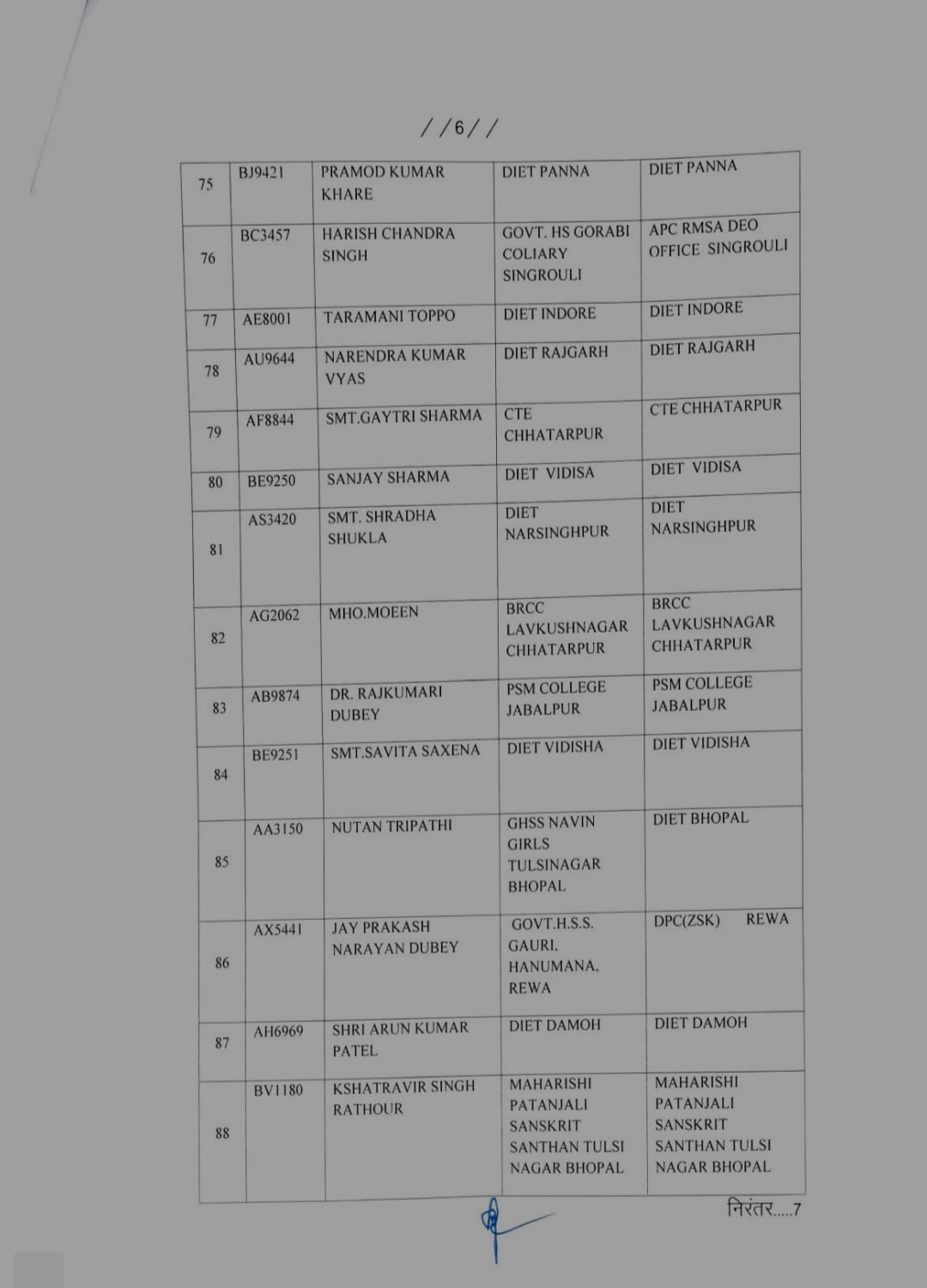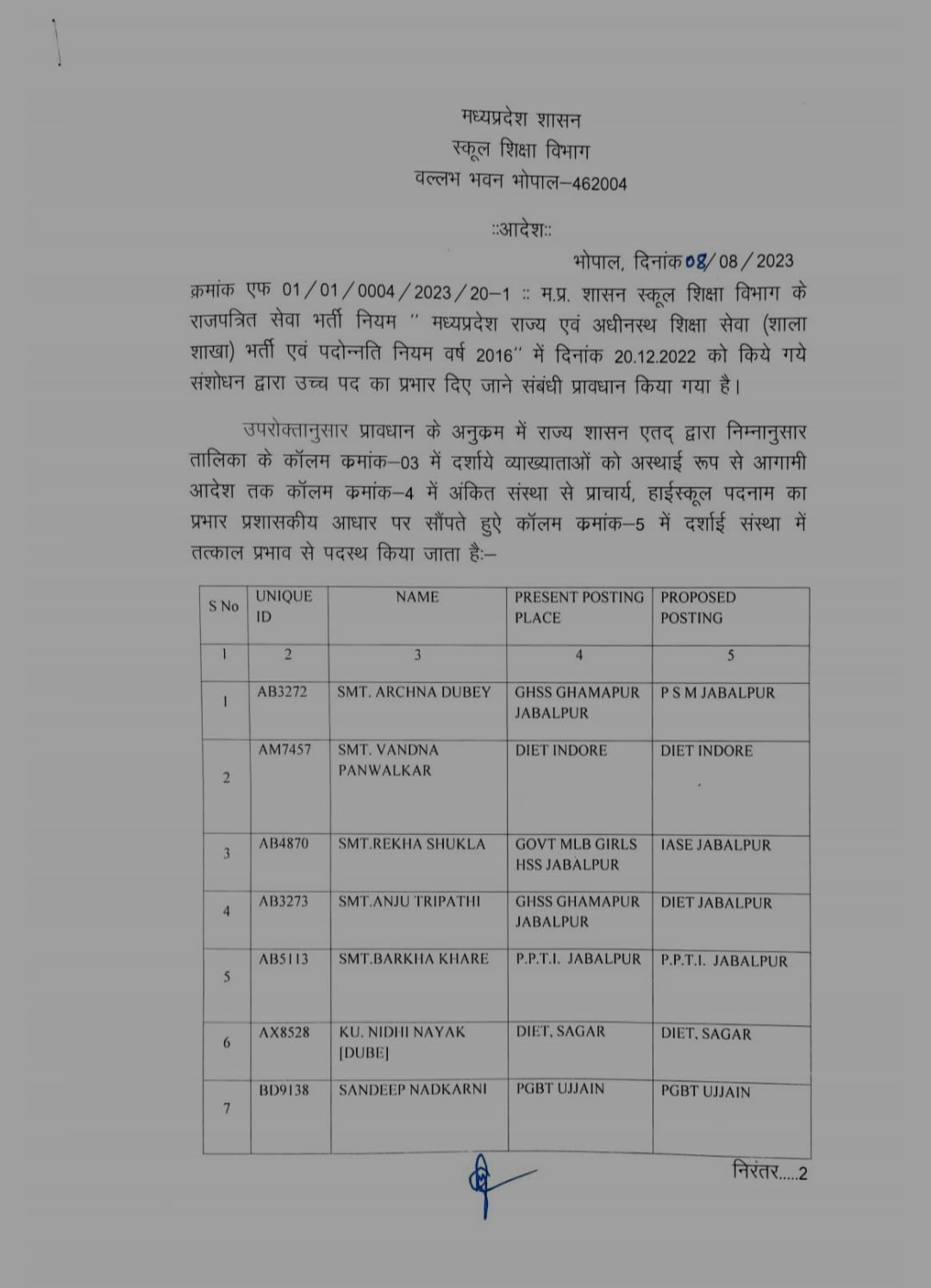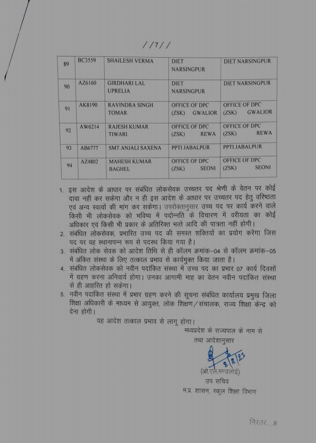 आदेश में कहा गया है कि जिन्हें उच्च पद का प्रभार दिया वे शिक्षा अधिकारी उस पद की शक्तियों का उपयोग कर सकेंगे। जिन्हें प्रभार सौंपा गया है उन्हें आदेश जारी होने की तारीख को तत्काल प्रभाव से कार्यमुक्त किया जाता है, वे 7 कार्यदिवस के अन्दर नवीन पदस्थापना वाले स्थान पर ज्वाइन करें, इसकी सूचना विभागीय प्रमुख को दें, इनका अगले महीने का वेतन नवीन पदस्थापना वाली संस्था से ही निकाला जा सकेगा।
