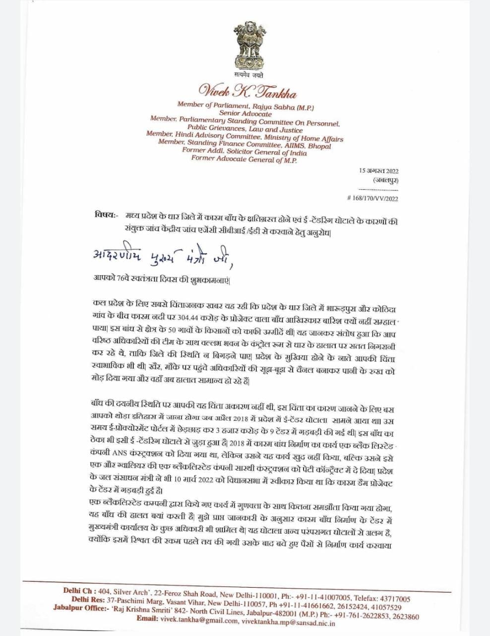 भोपाल, डेस्क रिपोर्ट। राज्यसभा सांसद विवेक तंखा ने मुख्यमंत्री शिवराज सिंह चौहान को पत्र लिखा है सांसद तंखा ने मध्यप्रदेश के धार जिले में कारम बांध के क्षतिग्रस्त होने एवं ई टेंडरिंग घोटाले के कारणों की संयुक्त जांच केंद्रीय जांच एजेंसी सीबीआई / ईडी से करवाने का अनुरोध किया है। तंखा ने अपने पत्र में लिखा है कि यह चिंताजनक है कि प्रदेश के धार जिले में कारम नदी पर 304.44 करोड़ के प्रोजेक्ट वाला बांध आखिरकार बारिश क्यों नही संभाल पाया, इस क्षेत्र के बांध से क्षेत्र के 50 गांवों के किसानों को काफी उम्मीदें थीं, लेकिन इस बांध ने लोगो का काफी नुकसान कर दिया। विवेक तंखा ने लिखा कि प्रदेश जानता है कि विगत कुछ वर्षो के दौरान मध्यप्रदेश में ई टेंडर में हस्तक्षेप के माध्यम से टेंडर में छेड़छाड़ की एक परंपरा रही है, इसके बारे में सर्वप्रथम जानकारी तब सामने आई जब भारत की एक विश्व स्तर की प्रसिद्ध कंपनी जो आधारभूत संरचना और निर्माण के क्षेत्र में अग्रणी है जिसने पूर्व में भी शासन द्वारा जारी किए गए ई टेंडर की प्रक्रिया में हिस्सा लिया था किंतु असफल रहने पर जब इसके कारणों की जांच कराई तो ई टेंडर प्रक्रिया में त्रुटि सामने आई, कंपनी ने इस बारे में विभाग से जुड़े वरिष्ठ अधिकारियों को भी अवगत कराया था।