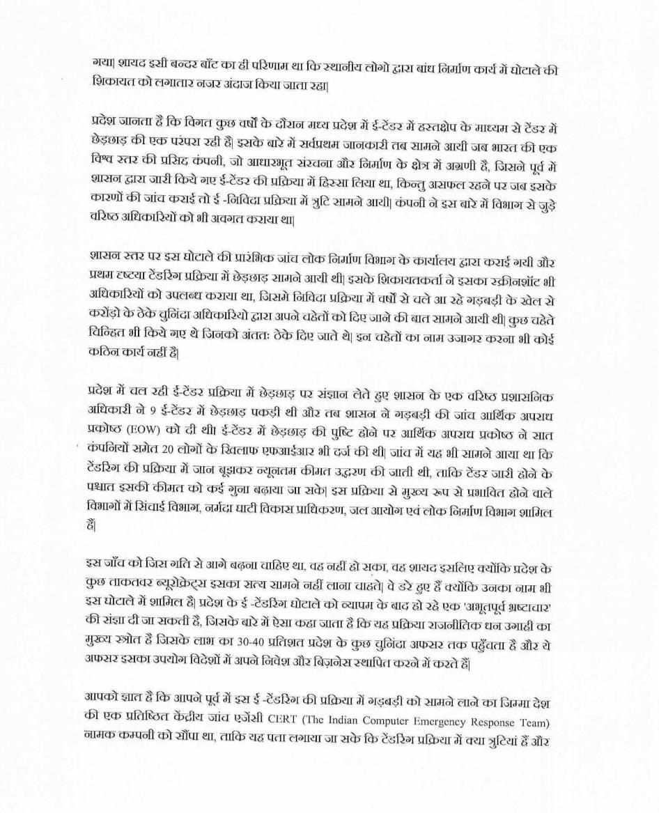 प्रदेश जानता है कि विगत कुछ वर्षों के दौरान मध्य प्रदेश में ई-टेंडर में हस्तक्षेप के माध्यम सेटेंडर में छेड़छाड़ की एक परंपरा रही है। इसके बारे में सर्वप्रथम जानकारी तब सामने आयी जब भारत की एक विश्व स्तर की प्रसिह कंपनी, जो आधारभूत संरचना और निर्माण के क्षेत्र में अग्रणी है, जिसने पूर्व में शासन द्वारा जारी किये गए ई-टेंडर की प्रक्रिया में हिस्सा लिया था, किन्तु असफल रहने पर जब इसके कारणों की जांच कराई तो ई-निविदा प्रक्रिया में त्रुटि सामने आयी कंपनी ने इस बारे में विभाग से जुड़े वरिष्ठ अधिकारियों को भी अवगत कराया था।