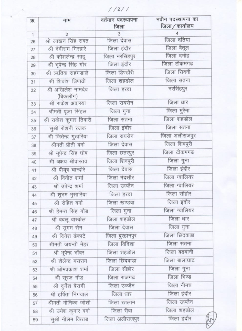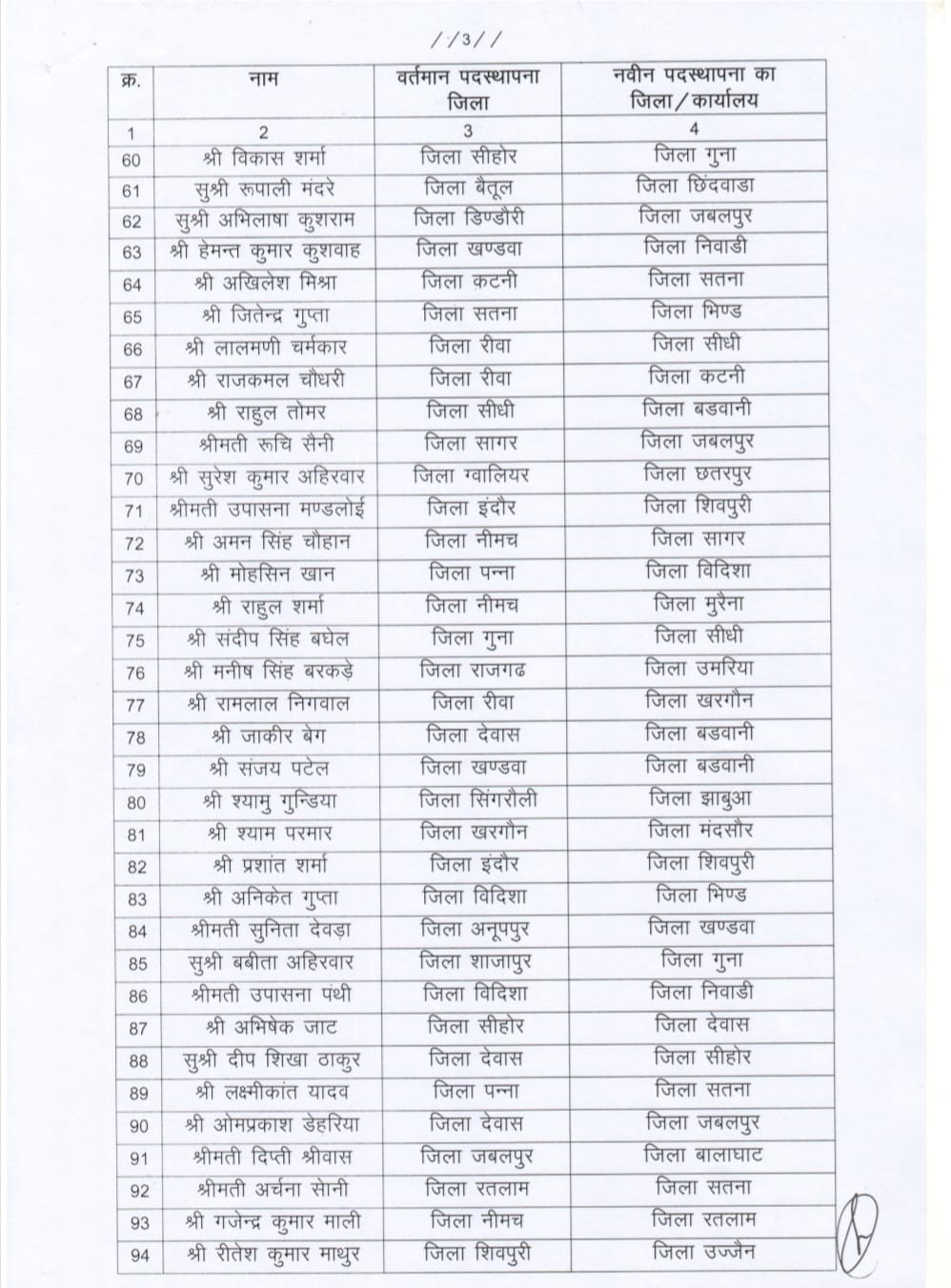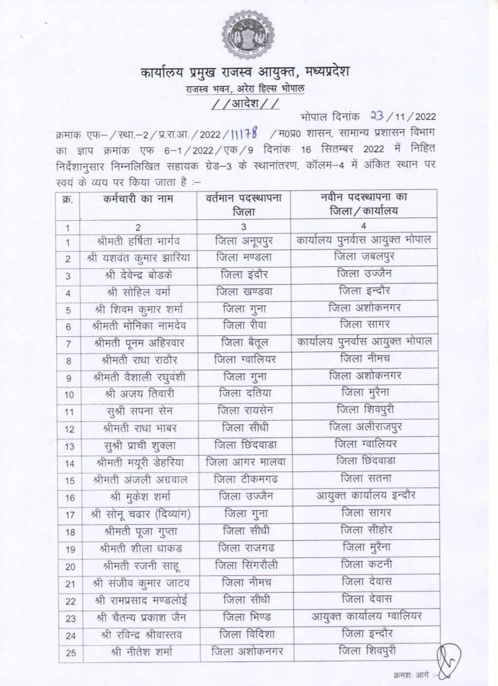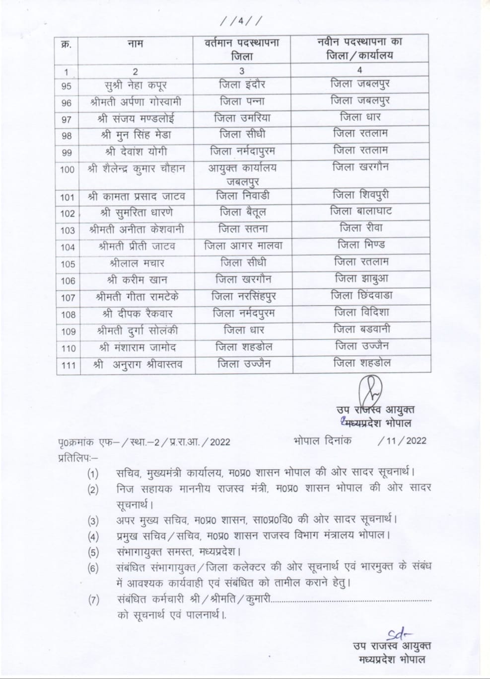 कार्यालय प्रमुख राजस्व आयुक्त मध्य प्रदेश के ऑफिस से जारी आदेश में 111 कर्मचारियों के नाम हैं जिन्हें एक जिले से दूसरे जिले में ट्रांसफर किया गया है।