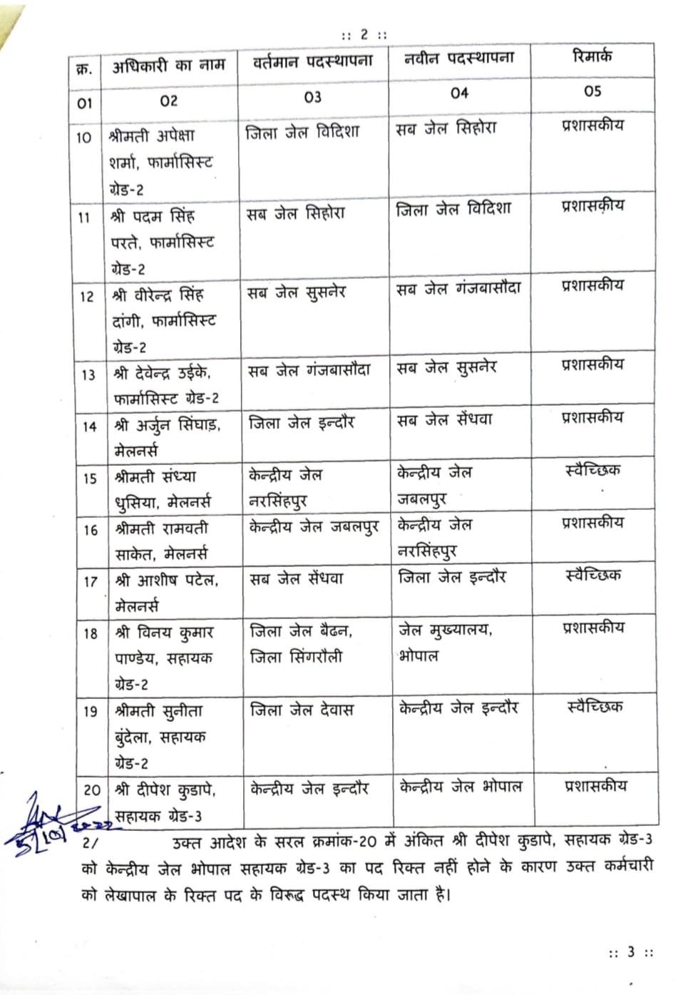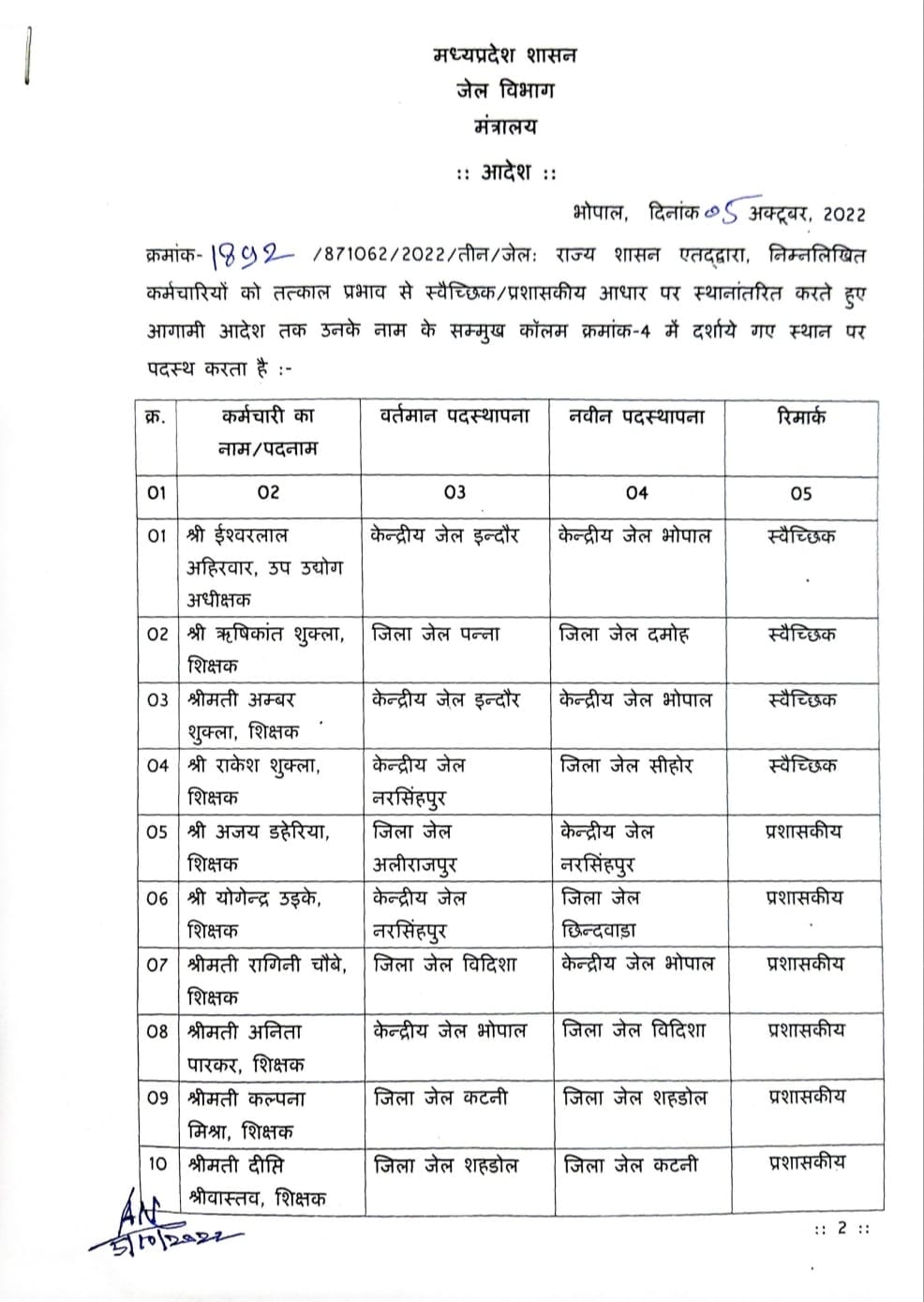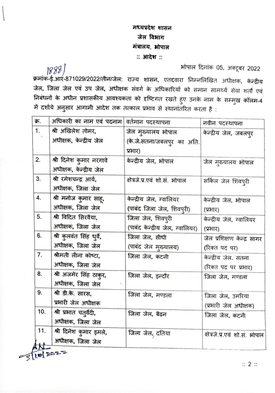 भोपाल, डेस्क रिपोर्ट। मप्र में जारी तबादलों (MP Transfer ) के क्रम में जेल विभाग में तबादलों (MP jail department transferred) की लिस्ट जारी की गई है , राज्य शासन ने जेल अधीक्षक, सहायक जेल अधीक्षक सहित कर्मचारियों के बड़े स्तर पर तबादले किये हैं। यहाँ आप इन अधिकारियों और कर्मचारियों के नाम और नई पद स्थापना देख सकते हैं।