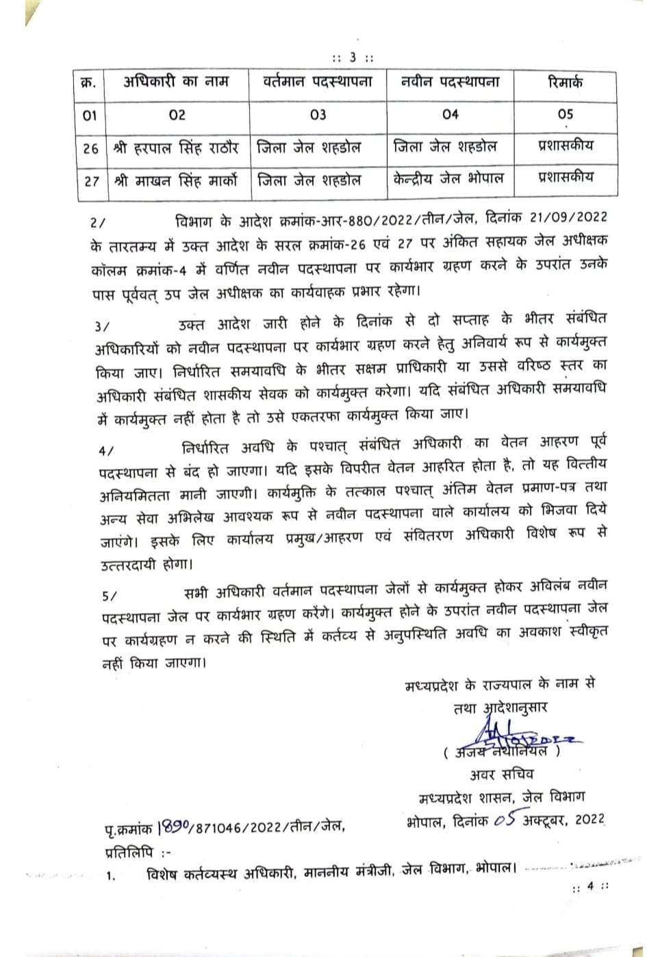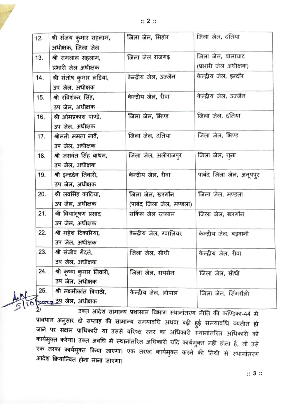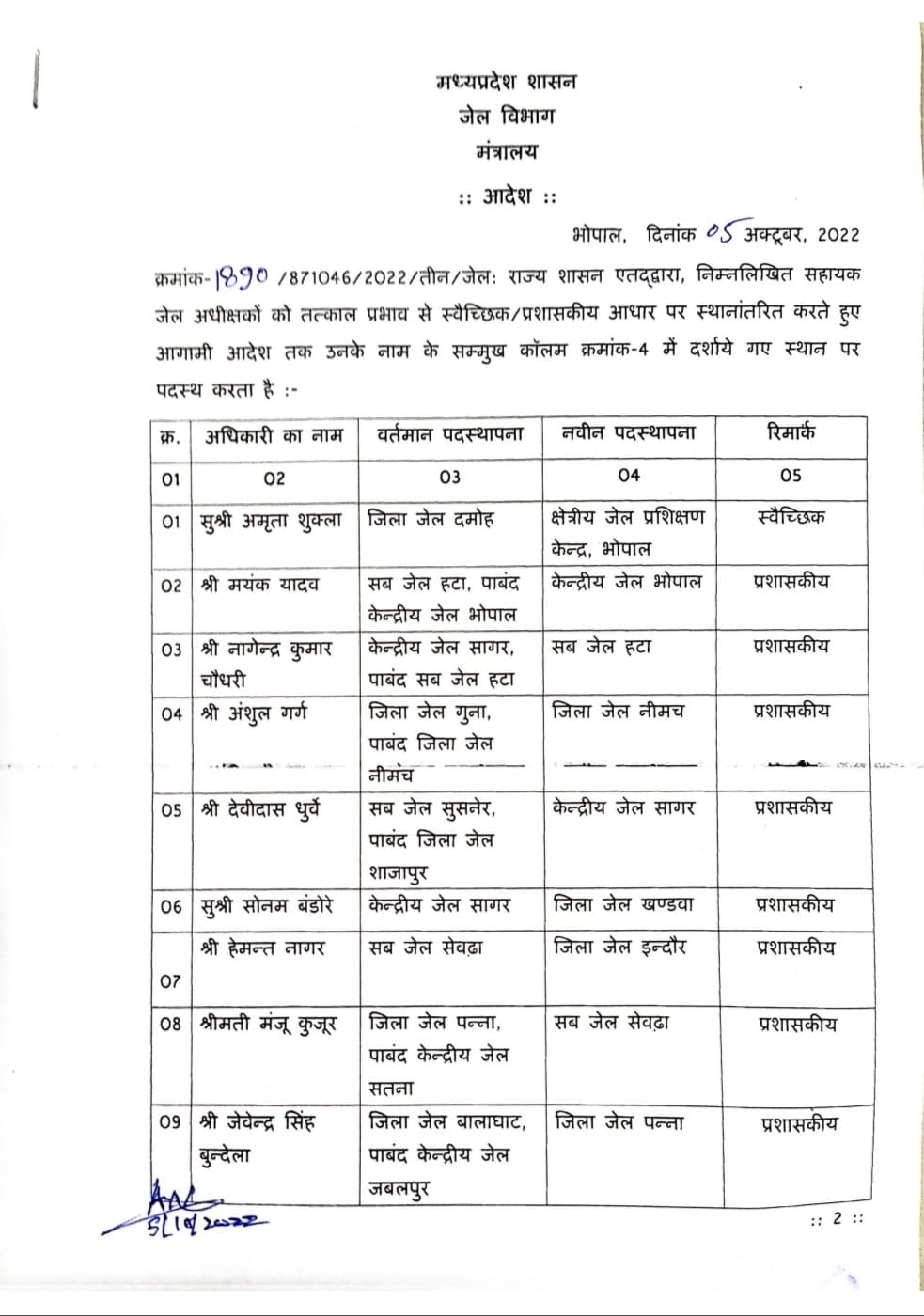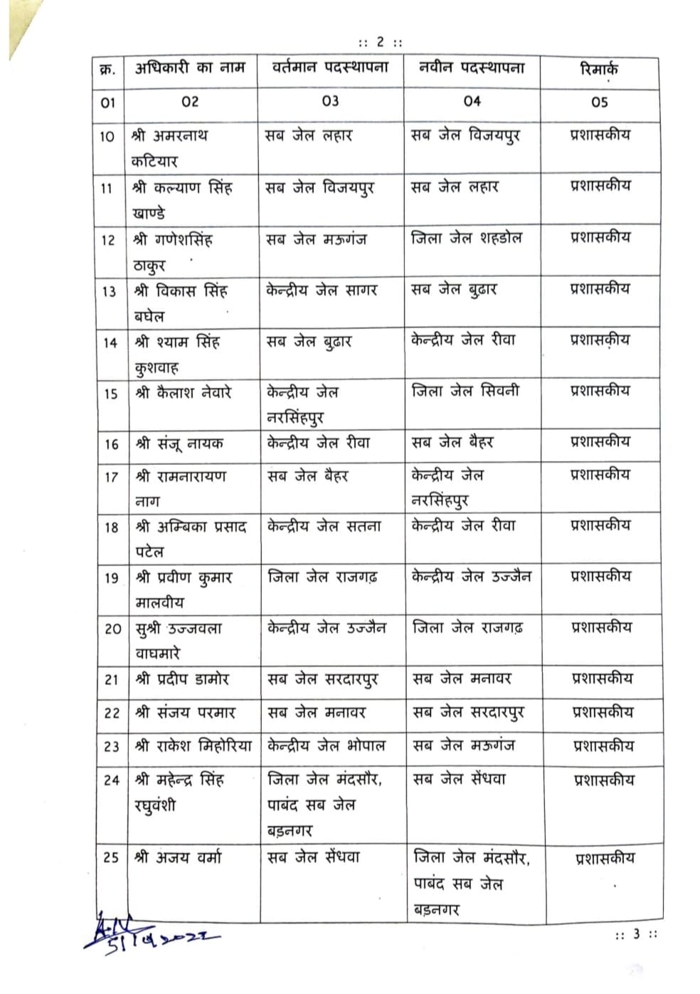 भोपाल, डेस्क रिपोर्ट। मप्र में जारी तबादलों (MP Transfer ) के क्रम में जेल विभाग में तबादलों (MP jail department transferred) की लिस्ट जारी की गई है , राज्य शासन ने जेल अधीक्षक, सहायक जेल अधीक्षक सहित कर्मचारियों के बड़े स्तर पर तबादले किये हैं। यहाँ आप इन अधिकारियों और कर्मचारियों के नाम और नई पद स्थापना देख सकते हैं।