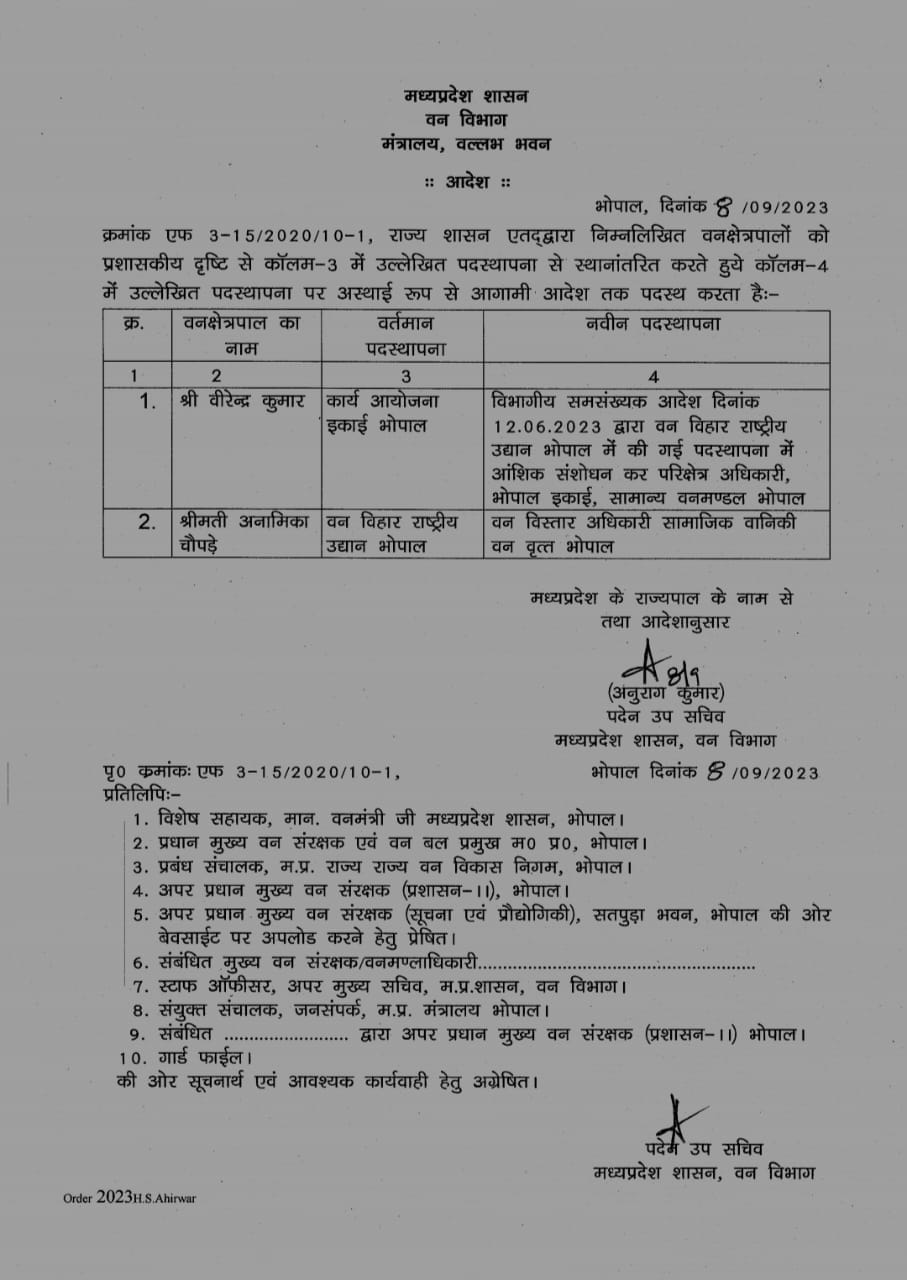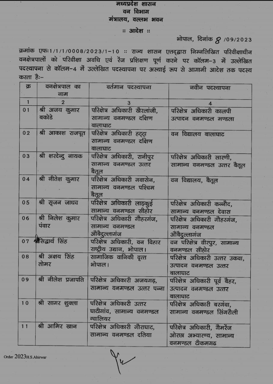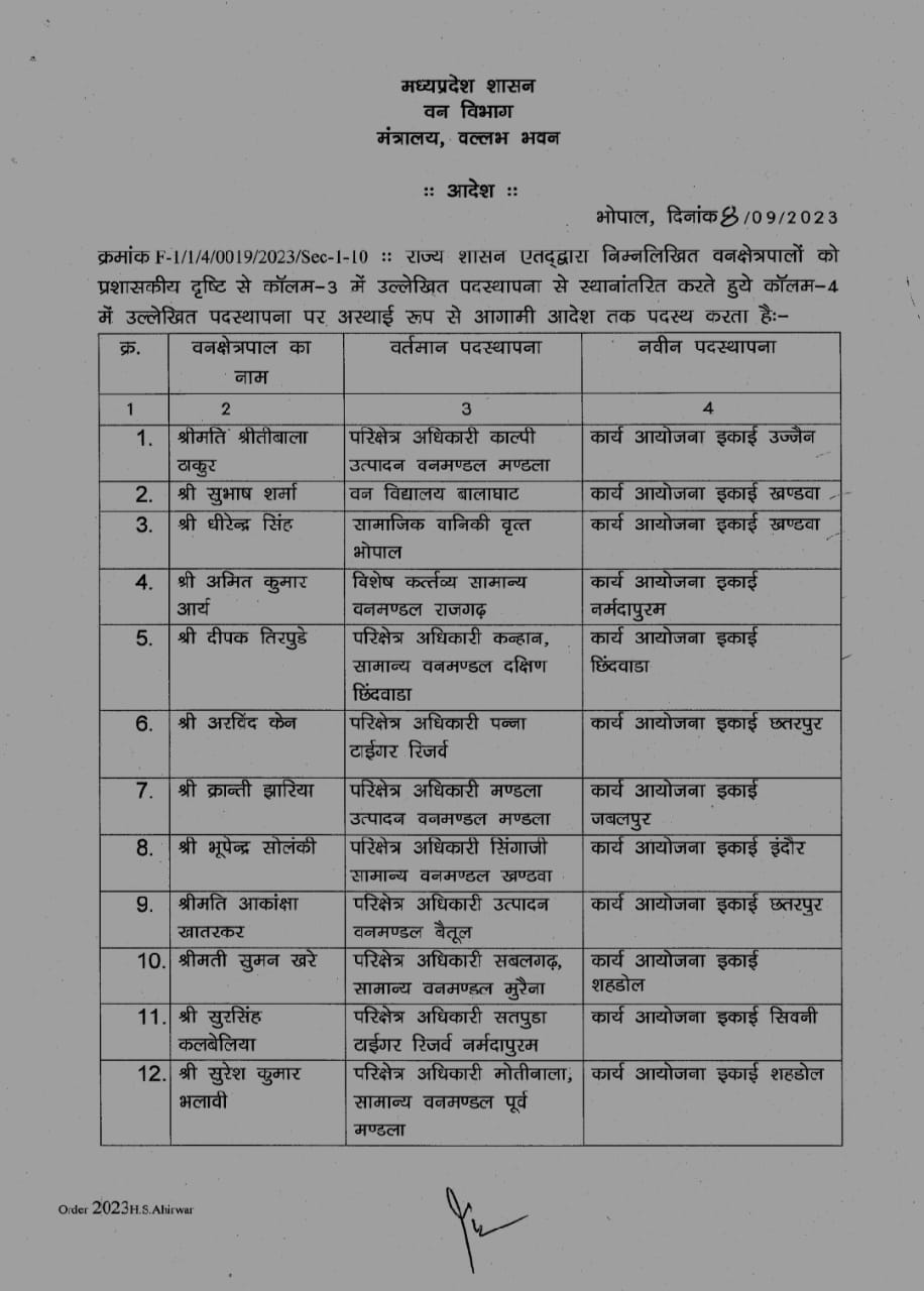MP Transfer : विधानसभा चुनावों से पहले मध्य प्रदेश में तबादलों का क्रम जारी है, आज मप्र शासन वन विभाग ने वन क्षेत्रपालों के तबादलों की तीन लिस्ट जारी की, जिसमें शामिल अधिकारियों को एक जगह से दूसरी जगह ट्रांसफर किया गया है।