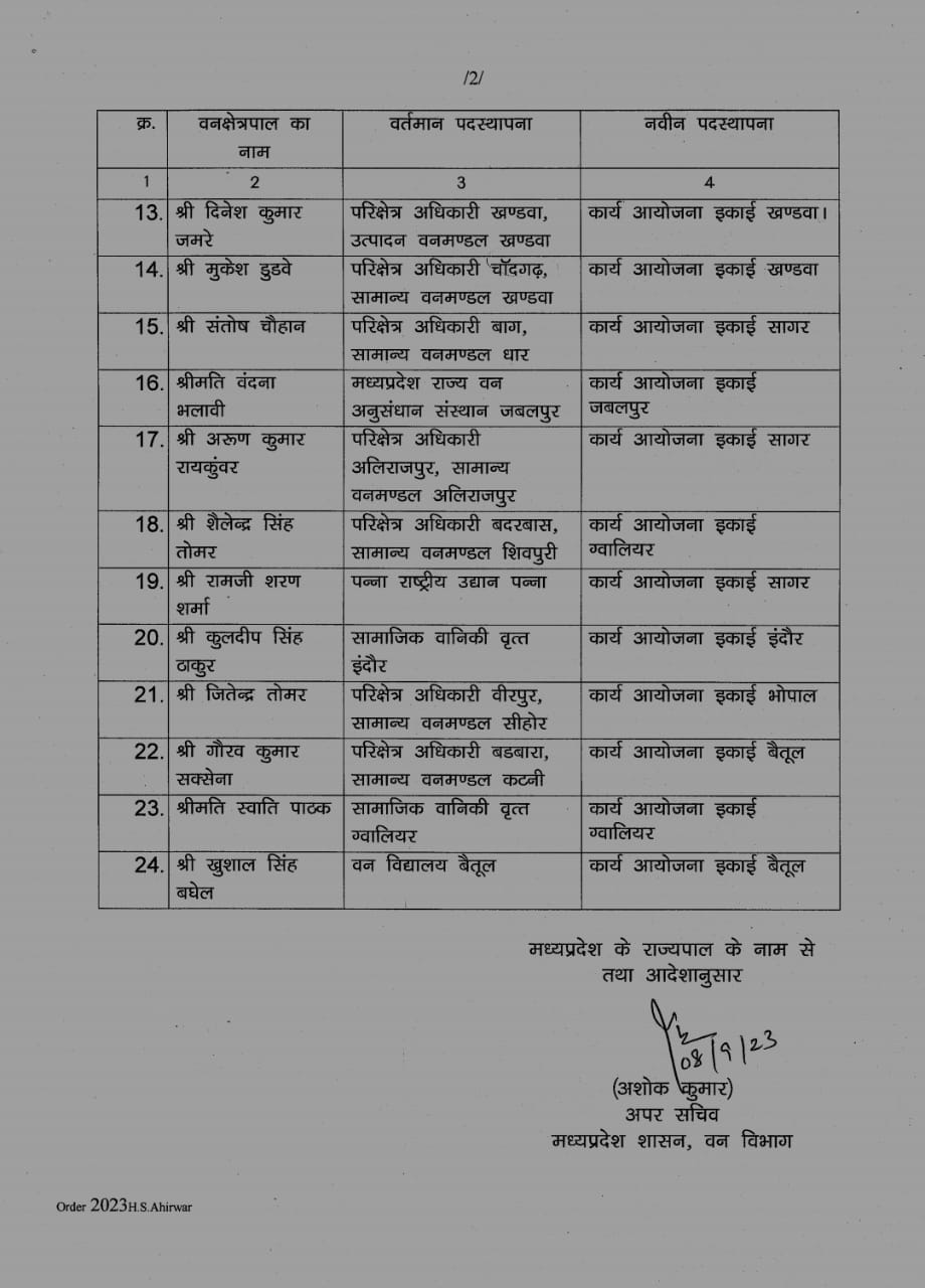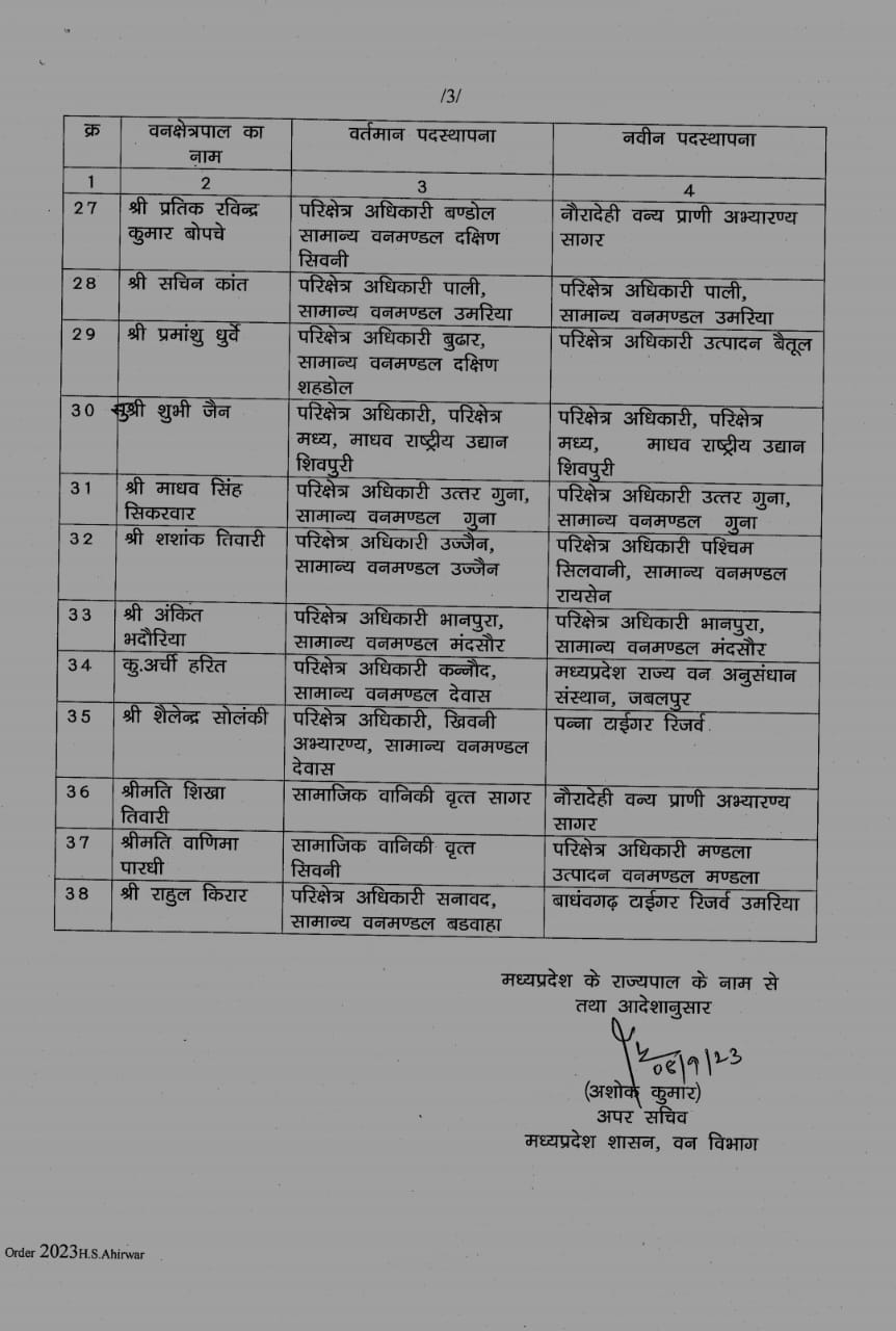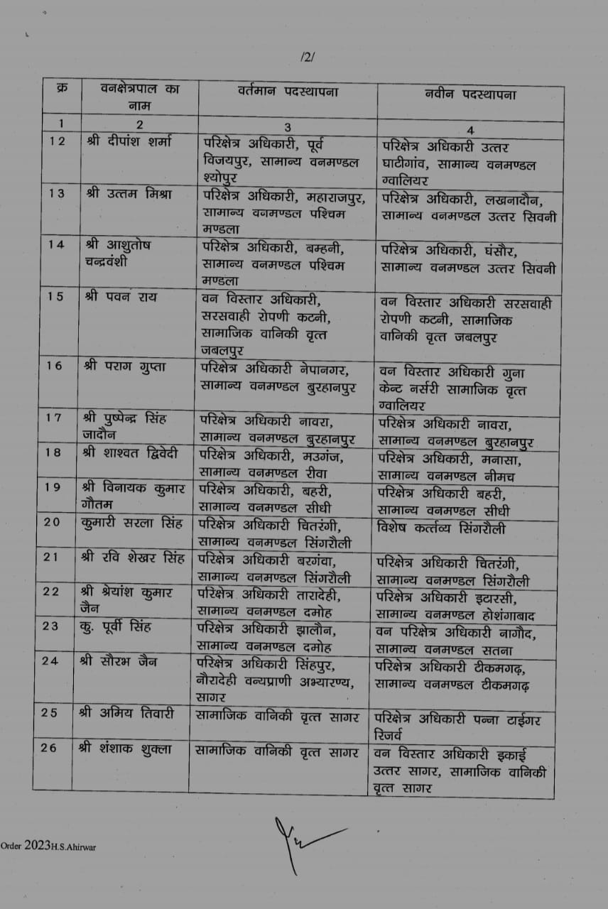 वन विभाग द्वारा जारी किये गए तीन अलग अलग आदेशों में से एक सूची में 24 वन क्षेत्रपालों, दूसरी सूची में दो वन क्षेत्रपालों और तीसरी सूची में 38 परिवीक्षाधीन वन क्षेत्रपालों के नाम शामिल हैं।