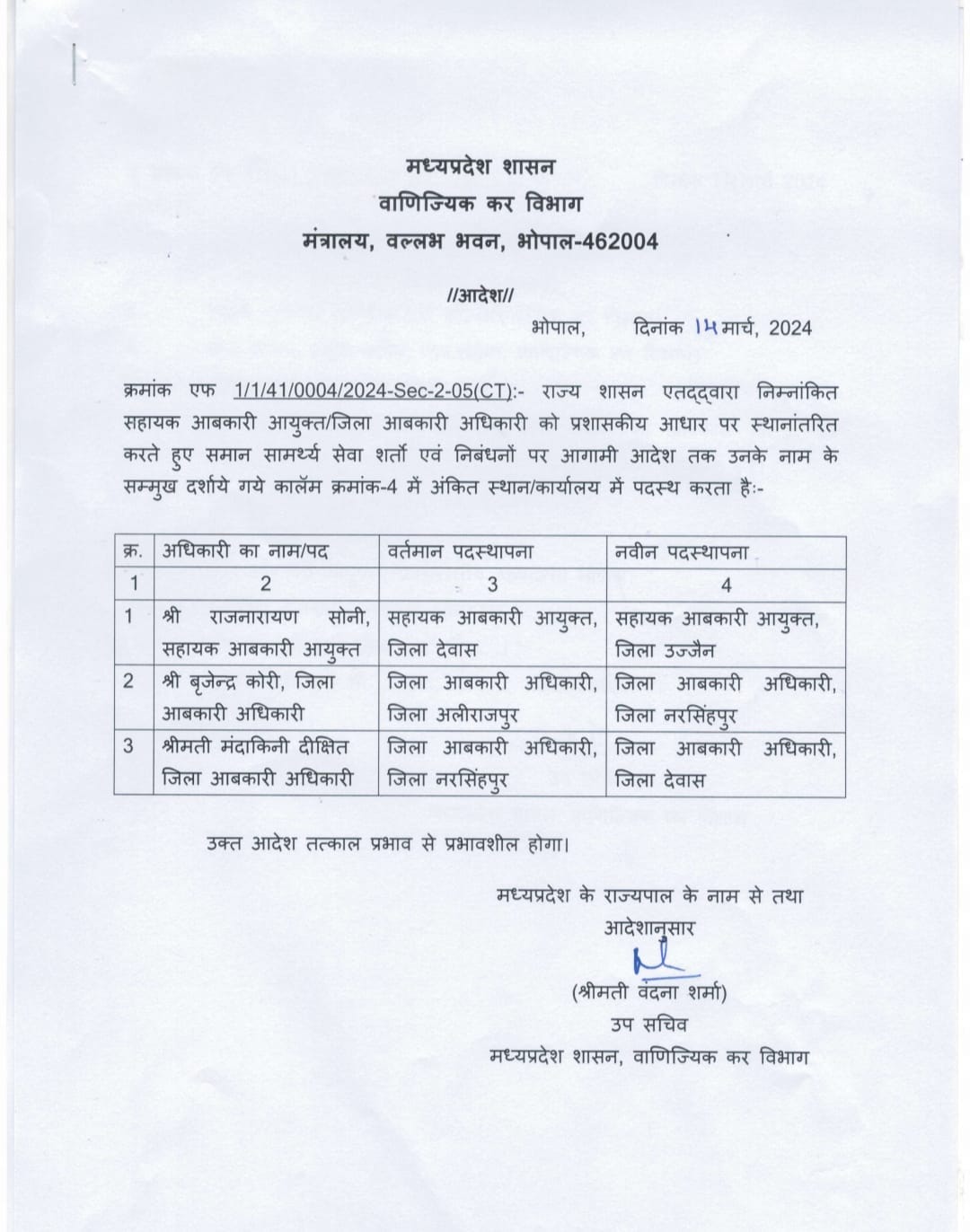 - मंदाकिनी दीक्षित जिला आबकारी अधिकारी नरसिंहपुर को जिला आबकारी अधिकारी देवास बनाया ।