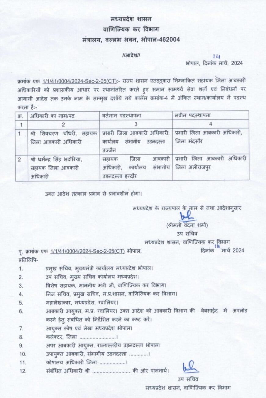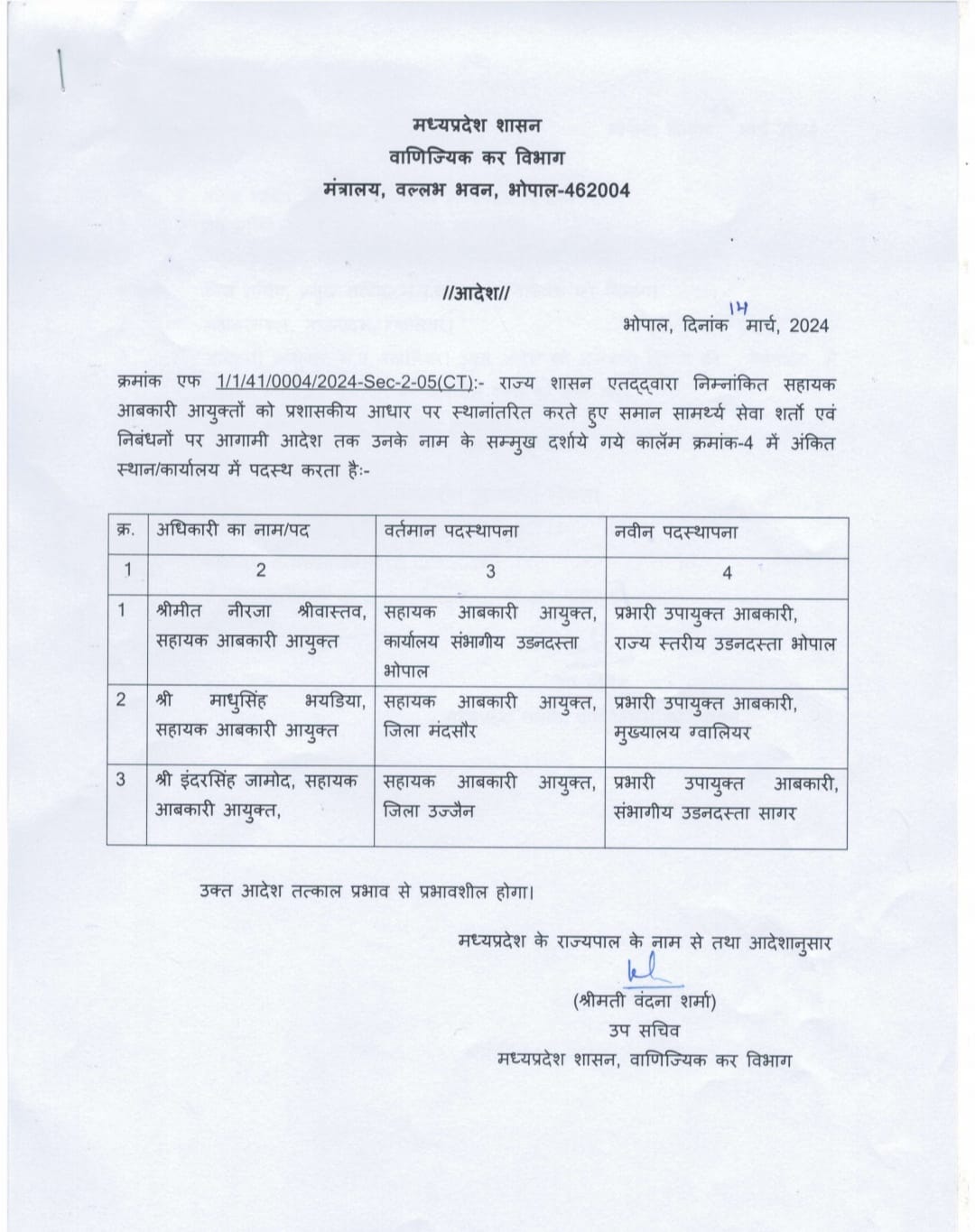 मप्र शासन के वाणिज्यिक कर विभाग ने सहायक आबकारी आयुक्त नीरजा श्रीवास्तव सम्भागीय उड़नदस्ता भोपाल को प्रभारी उपायुक्त राज्यस्तरीय उड़नदस्ता भोपाल के पद पर पदस्थ किया है, वहीं मधु सिंह भयडिया को सहायक आबकारी आयुक्त मंदसौर से प्रभारी उपायुक्त आबकारी मुख्यालय ग्वालियर पदस्थ किया है और इंदर सिंह जामोद सहायक आबकारी आयुक्त उज्जैन को प्रभारी उपायुक्त संभागीय उड़नदस्ता सागर के पद पर पदस्थ किया है और राज नारायण सोनी, सहायक आबकारी आयुक्त देवास को सहायक आबकारी आयुक्त उज्जैन पदस्थ किया है।