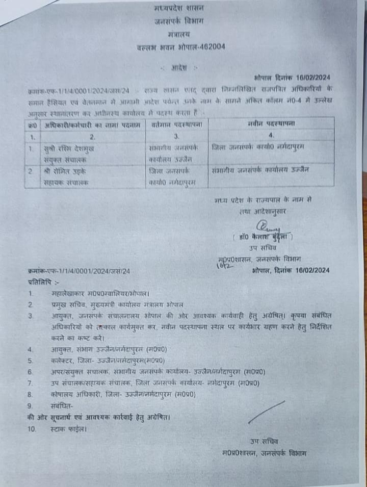 मध्य प्रदेश जनसंपर्क विभाग ने तबादला आदेश जारी करते हुए एक संयुक्त संचालक और एक सहायक संचालक का तबादला किया है, शासन के आदेश में संयुक्त संचालक रश्मि देशमुख को संभागीय जनसंपर्क कार्यालय उज्जैन से जिला जनसंपर्क कार्यालय नर्मदापुरम भेजा गया है और सहायक संचालक रोमित उइके को जिला जनसंपर्क कार्यालय नर्मदापुरम से संभागीय जनसंपर्क कार्यालय उज्जैन ट्रांसफर किया गया है।