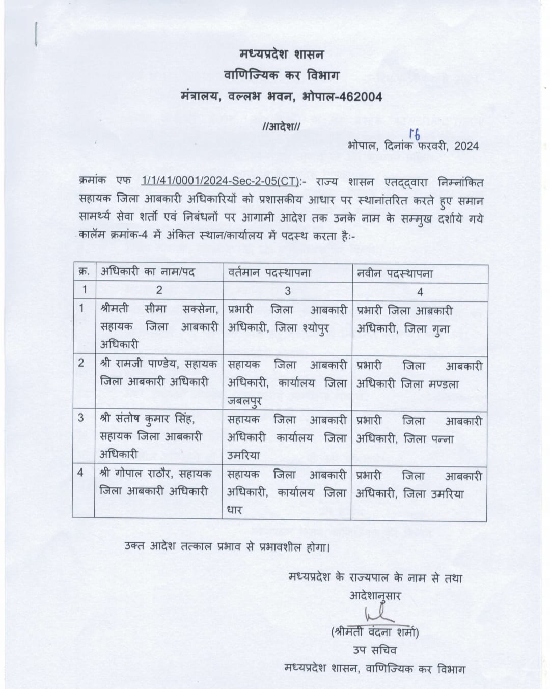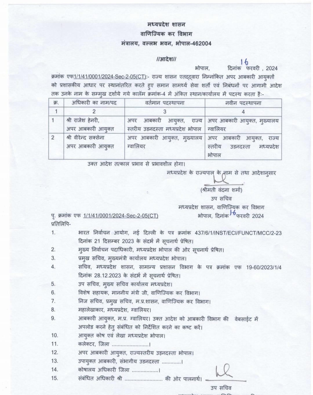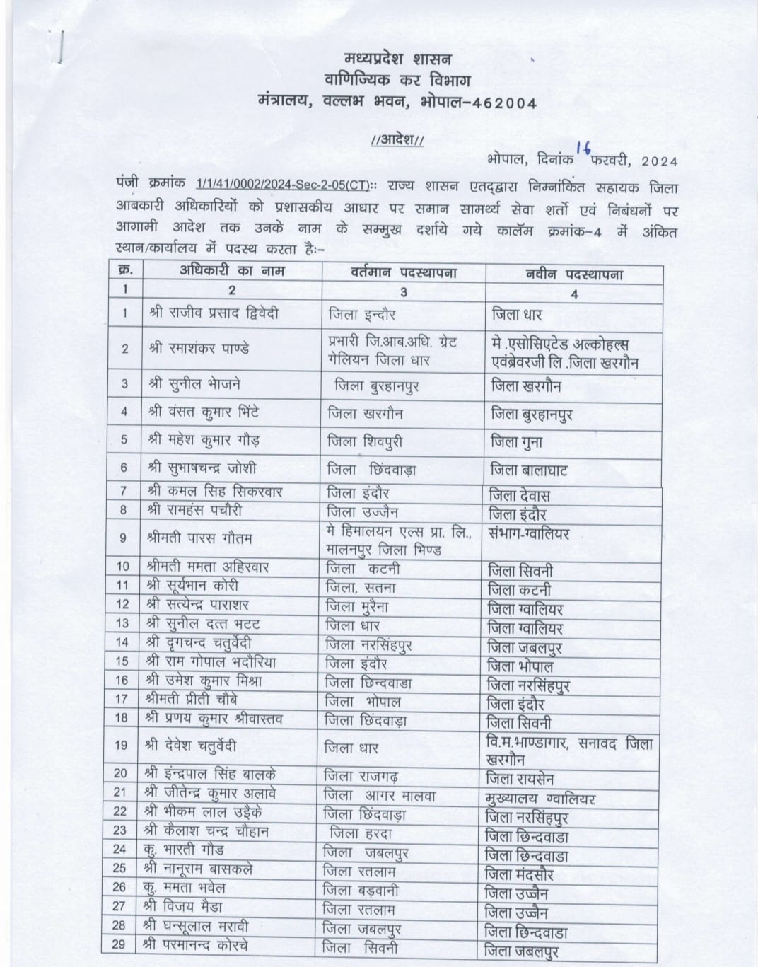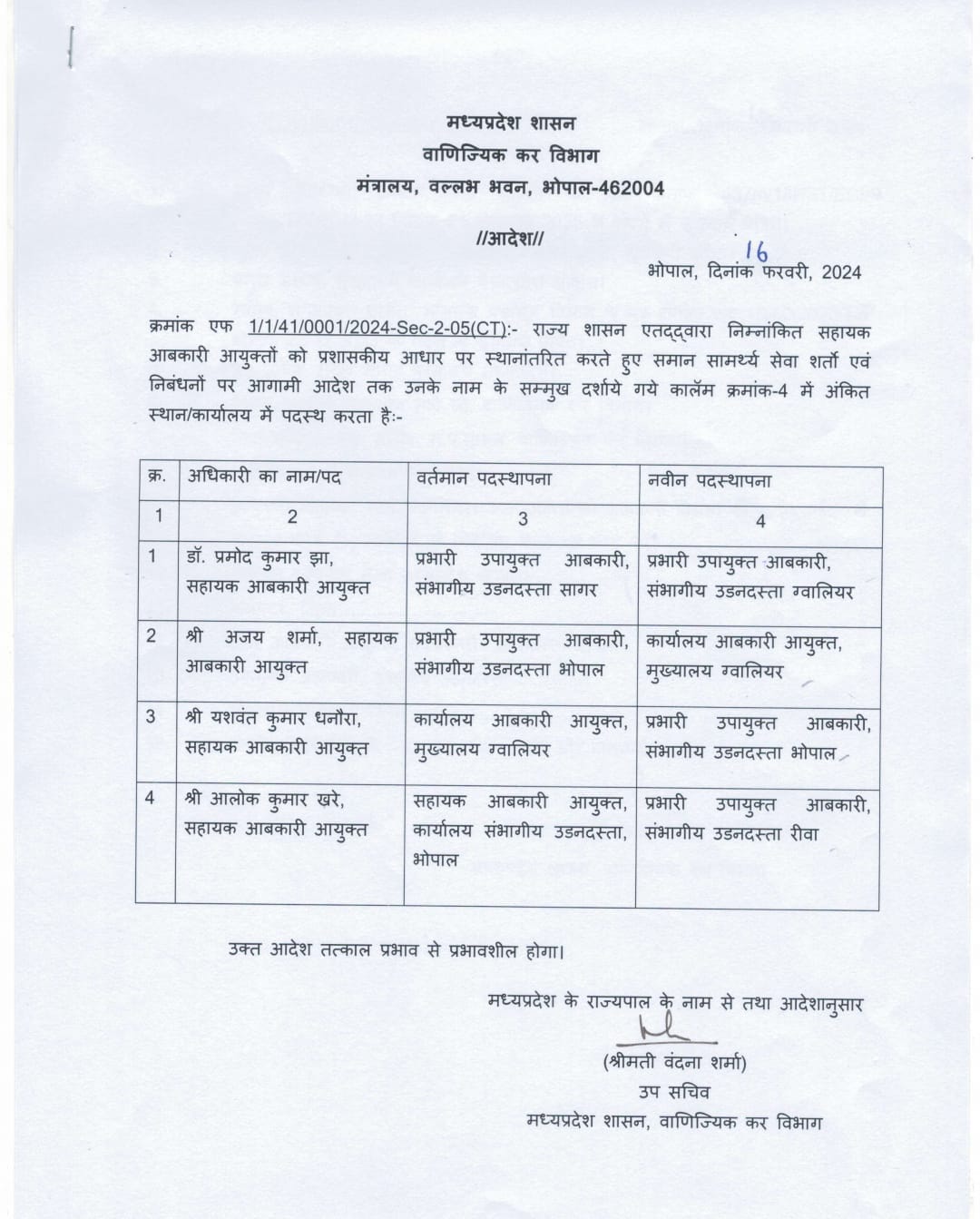 दो अपर आबकारी आयुक्तों को एक दूसरे की जगह पदस्थ किया