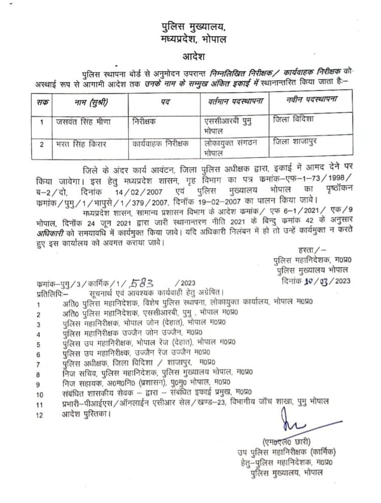 पुलिस मुख्यालय से जारी आदेश में SCRB पुलिस मुख्यालय भोपाल में पदस्थ इंस्पेक्टर जसवंत सिंह मीणा को विदिशा जिले में भेजा है जबकि लोकायुक्त संगठन भोपाल में पदस्थ कार्यवाहक इंस्पेक्टर भरत सिंह किरार को जिला शाजापुर पदस्थ किया है।