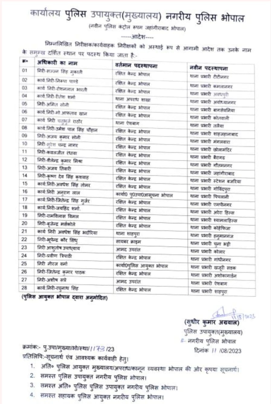 पुलिस उपायुक्त कार्यालय नगरीय पुलिस भोपाल द्वारा जारी आदेश के मुताबिक इंस्पेक्टर सज्जन सिंह मुकाती को टीटी नगर, कार्यवाहक निरीक्षक निरूपा पांडेय को कमला नगर, कार्यवाहक निरीक्षक रोशनलाल भारती को अवधपुरी, कार्यवाहक निरीक्षक रीतेश शर्मा को अयोध्या नगर, निरीक्षक अमित सोनी को बागसेवनिया, कार्यवाहक निरीक्षक मोहम्मद आफताब खान को कोतवाली, कार्यवाहक निरीक्षक चतर्भुज राठौर को तलैया, कार्यवाहक निरीक्षक उमेश पाल सिंह चौहान को शाहजहांनाबाद, निरीक्षक अजय कुमार सोनी को मंगलवारा, निरीक्षक सुरेशचंद्र नागर को छोला मंदिर, निरीक्षक कंवलजीत सिंह रंधावा को बैरागढ़, निरीक्षक शैलेंद्र मिश्रा को गौतम नगर, निरीक्षक अजय तिवारी को जहांगीराबाद, निरीक्षक कृष्णदेव सिंह कुशवाह को स्टेशन बजरिया का टीआई बनाया गया है।