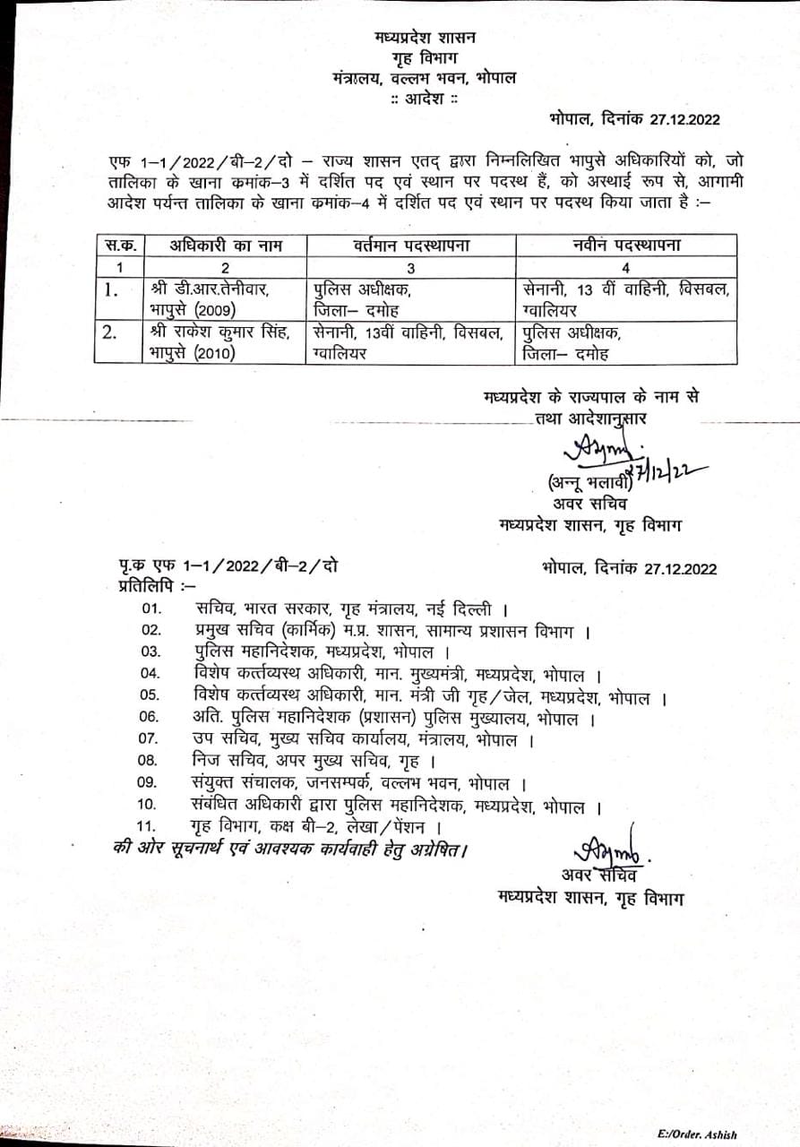 आज मंगलवार 27 दिसंबर को राज्य शासन के गृह विभाग ने एक तबादला आदेश जारी किया है, इस आदेश में दो IPS अधिकारियों को इधर से उधर किया गया है, शासन ने दमोह के पुलिस अधीक्षक 2009 बैच के IPS अधिकारी डी आर तेनीवार को वहां से हटाकर 13 वीं वाहिनी एसएएफ ग्वालियर का कमांडेंट बनाया है, शासन ने इसकी जगह 2010 बैच के IPS अधिकारी 13 वीं वाहिनी एसएएफ ग्वालियर के कमांडेंट राकेश कुमार सिंह को पुलिस अधीक्षक दमोह बनाया है।