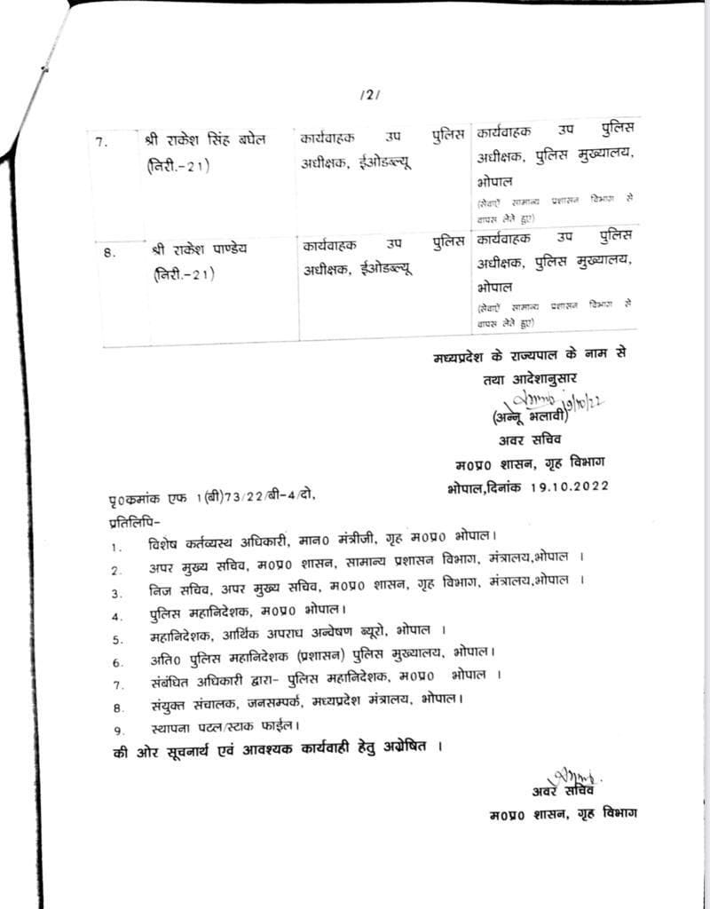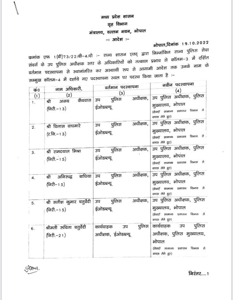 भोपाल, डेस्क रिपोर्ट। मप्र में इस समसय तबादले जारी हैं। राज्य शासन लगातार अलग अलग विभागों की तबादला सूची जारी कर रहा है। आज गृह विभाग (MP Home Department) ने उप पुलिस अधीक्षक की तबादला (MP EOW DSP Transfer ) सूची जारी की है। इस तबादला सूची में EOW के 8 डीएसपी को पुलिस मुख्यालय पदस्थ किया गया है।