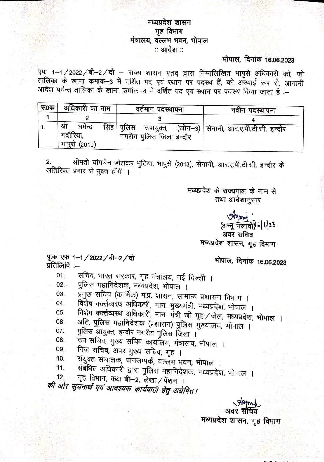 गृह विभाग के अवर सचिव अन्नू भलावी के हस्ताक्षर से जारी तबादला आदेश में 2010 बैच के आईपीएस अधिकारी धर्मेन्द्र सिंह भदौरिया को RAPTC इंदौर का कमान्डेंट नियुक्त किया है, श्री भदौरिया इस समय पुलिस उपायुक्त (जोन 3 ) नगरीय पुलिस जिला इंदौर में पदस्थ हैं।