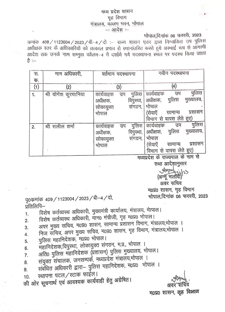 तबादला सूची के मुताबिक कार्यवाहक डीएसपी योगेश कुरचानिया और कार्यवाहक डीएसपी सलील शर्मा को विशेष पुलिस स्थापना लोकायुक्त संगठन भोपाल से ट्रांसफर कर पुलिस मुख्यालय भोपाल पदस्थ किया गया है। गृह विभाग ने सामान्य प्रशासन विभाग से इनकी सेवाएं वापस ले ली हैं।