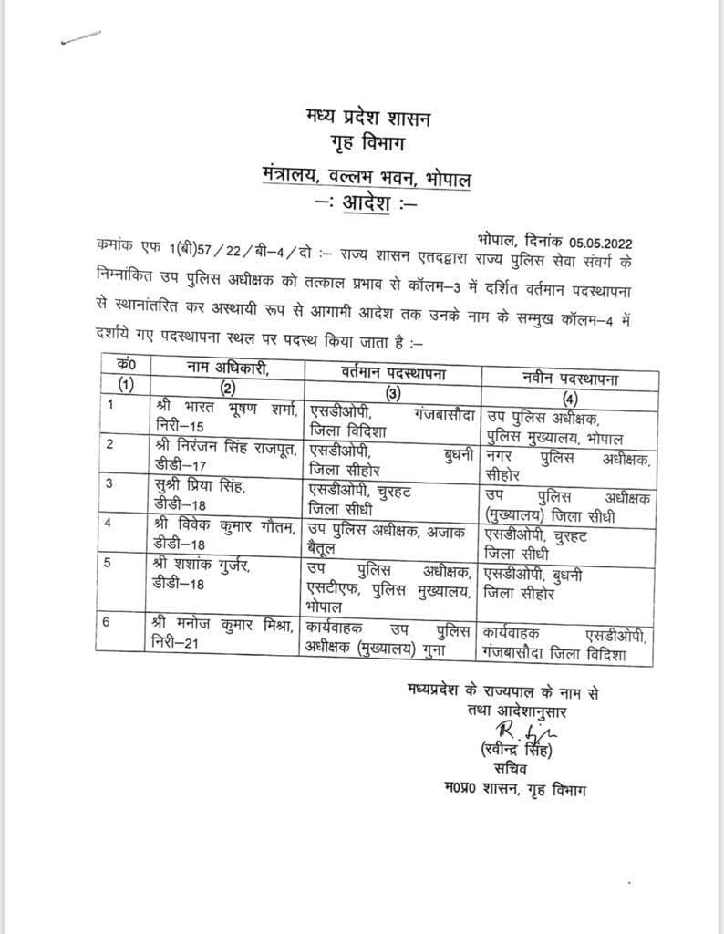 भोपाल, डेस्क रिपोर्ट। मध्य प्रदेश में तबादलों (MP Transfer) का दौर जारी है। गृह विभाग ने गुरुवार को राज्य पुलिस सेवा के (MP Police Transfer) अधिकारियों के तबादला आदेश जारी किये हैं। वल्लभ भवन से जारी आदेश में डीएसपी स्तर के 6 अधिकारियों को ट्रांसफर (DSP Transfer) किया गया है। सूची इस प्रकार है।