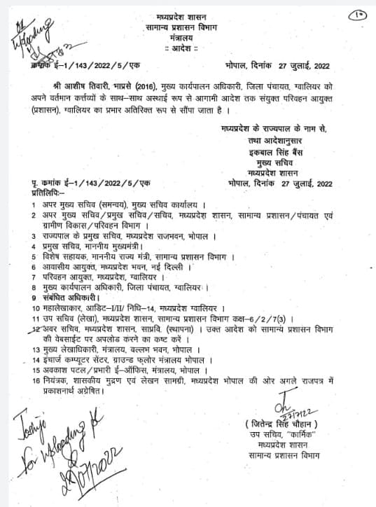 भोपाल, डेस्क रिपोर्ट। मप्र (MP Transfer) सरकार ने एक सिंगल तबादला आदेश जारी कर भारतीय प्रशासनिक सेवा के एक अधिकारी का तबादला (IAS Transfer) किया है। सामान्य प्रशासन विभाग (MP General Administration Department) के इस आदेश में भारतीय प्रशासनिक सेवा के 2016 बैच के अधिकारी, ग्वालियर जिला पंचायत के मुख्य कार्यपालन अधिकारी आशीष तिवारी को अगले आदेश तक संयुक्त परिवहन आयुक्त परिवहन मुख्यालय ग्वालियर का अतिरिक्त प्रभार (MP IAS Transfer) सौंपा गया है।