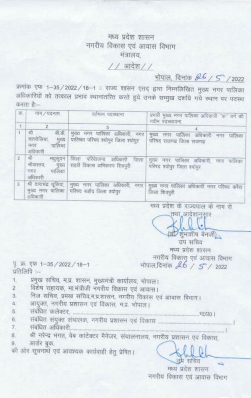 भोपाल, डेस्क रिपोर्ट। प्रदेश में पंचायत चुनावों को देखते हुए तबादलों (MP Transfer) का सिलसिला जारी है। नगरीय विकास एवं आवास विभाग ने आदेश जारी कर तीन अधिकारियों के तबादला आदेश जारी किये हैं। यहाँ लिस्ट देखें।
